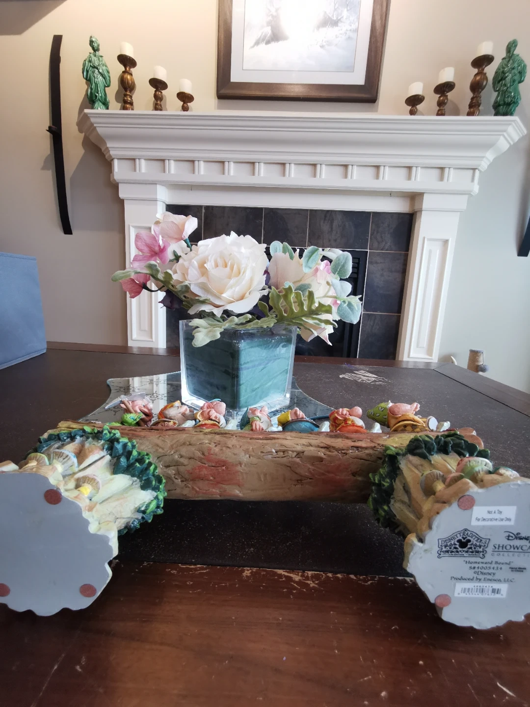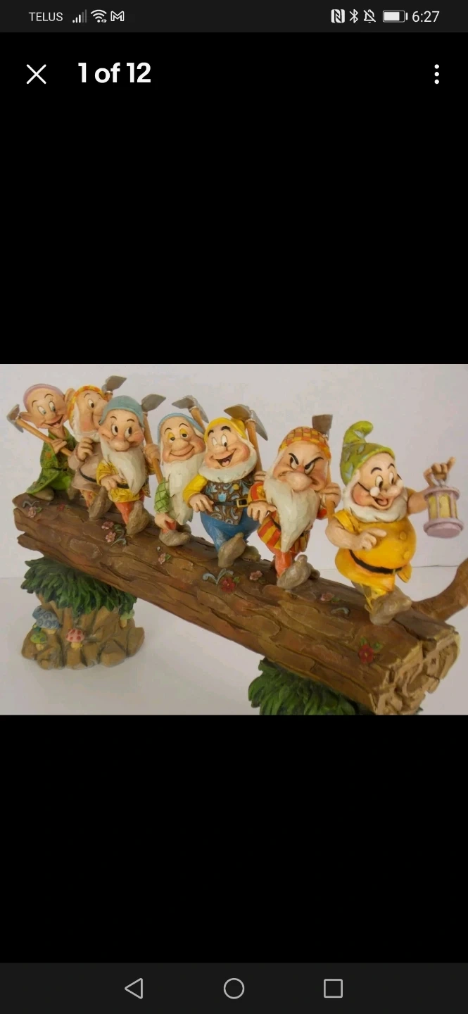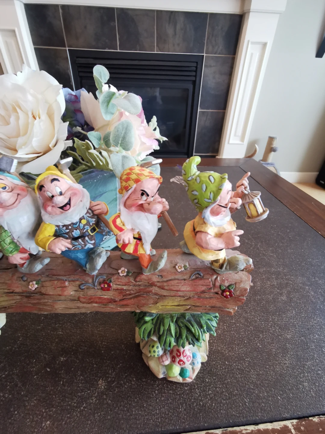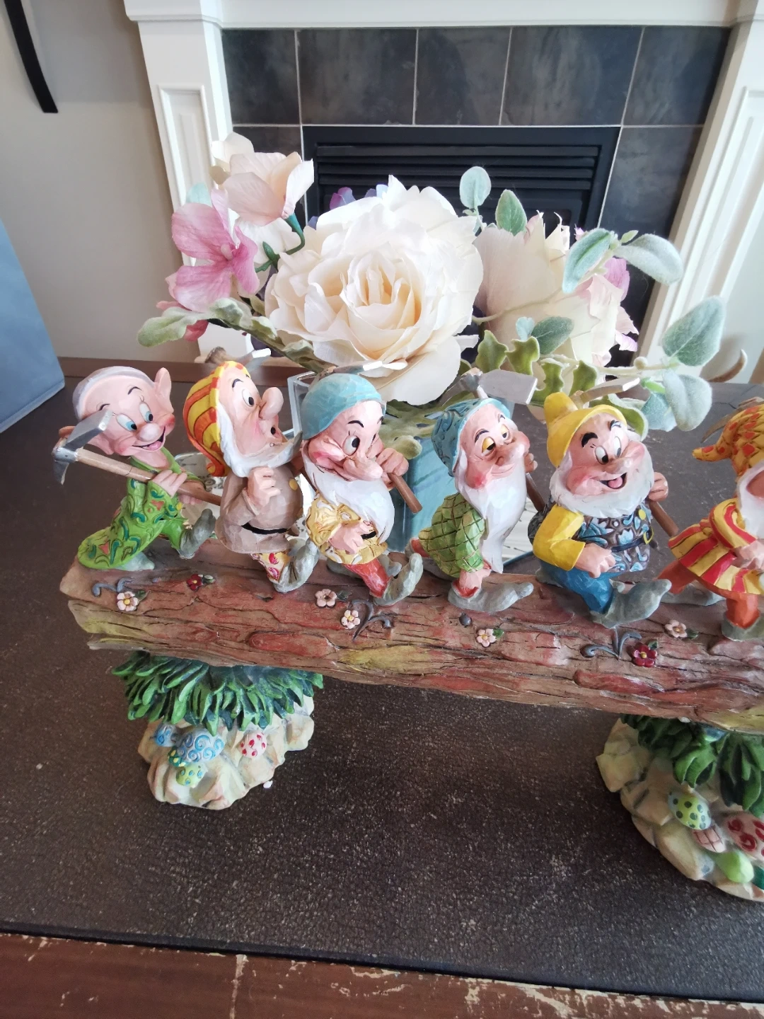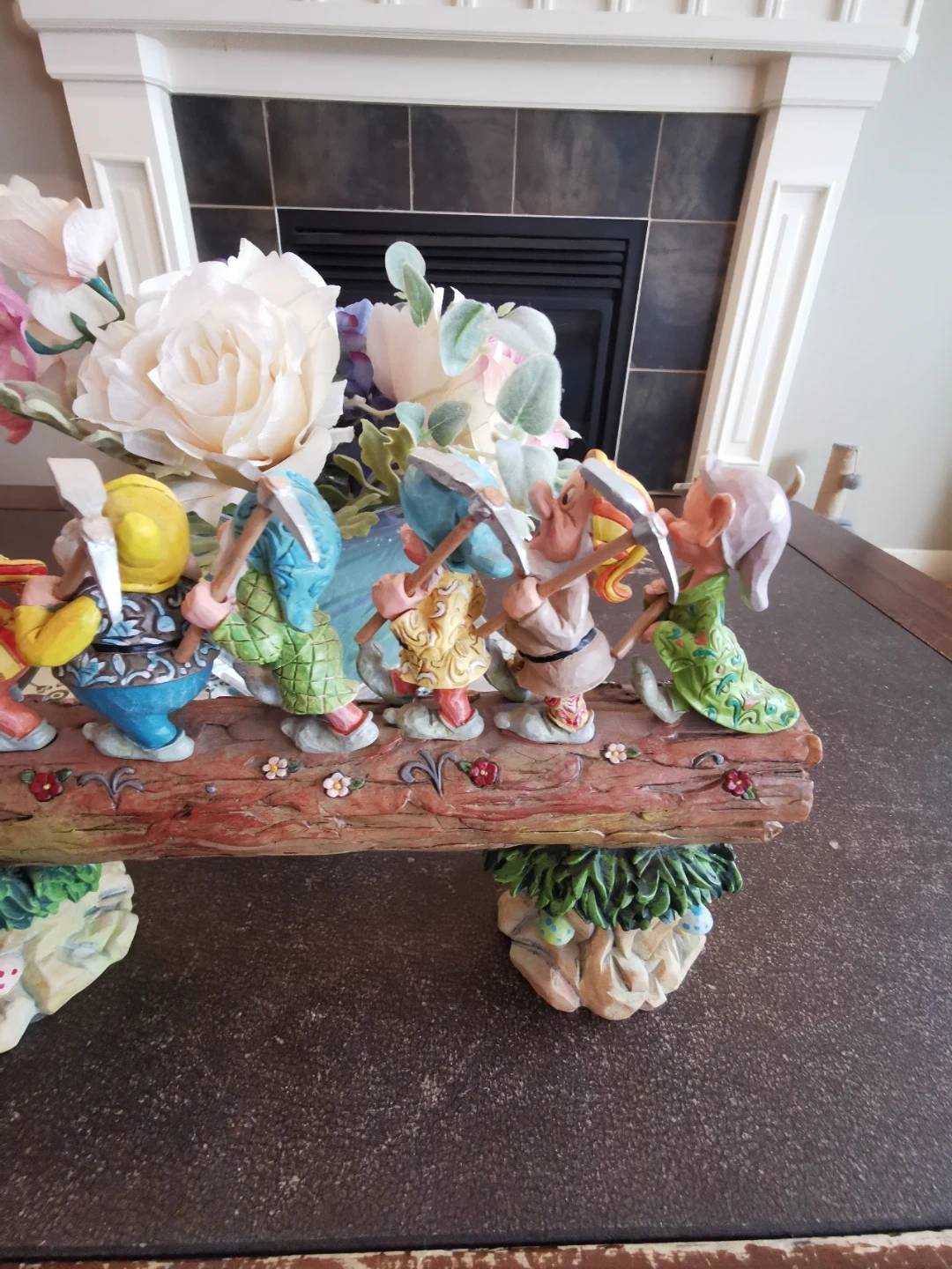 This figurine features all seven dwarfs walking along a log. It's made of painted resin and comes with faux floral accents. It's a charming piece for any Disney fan's collection.