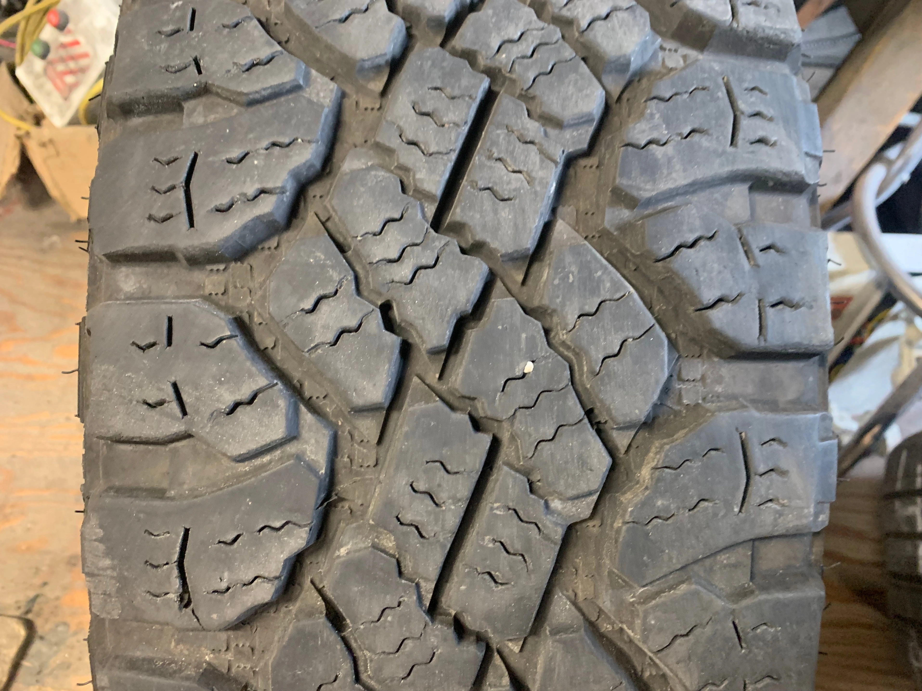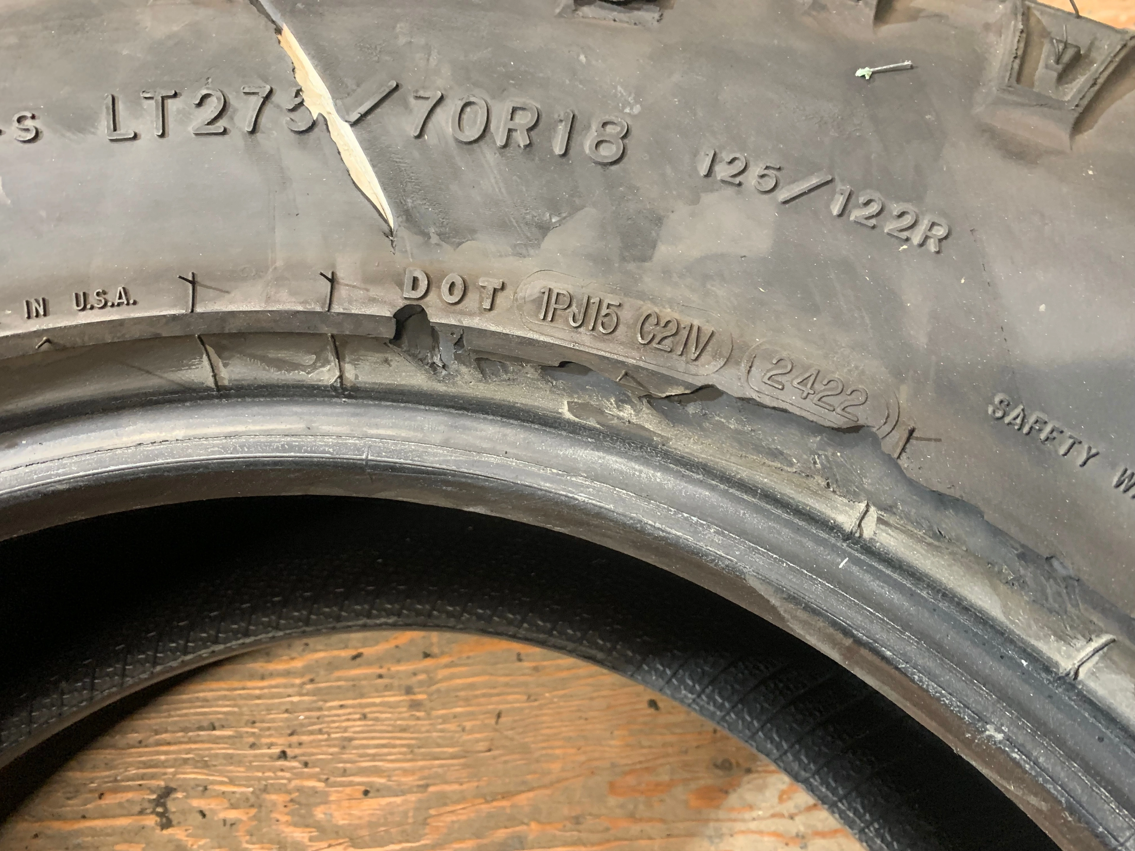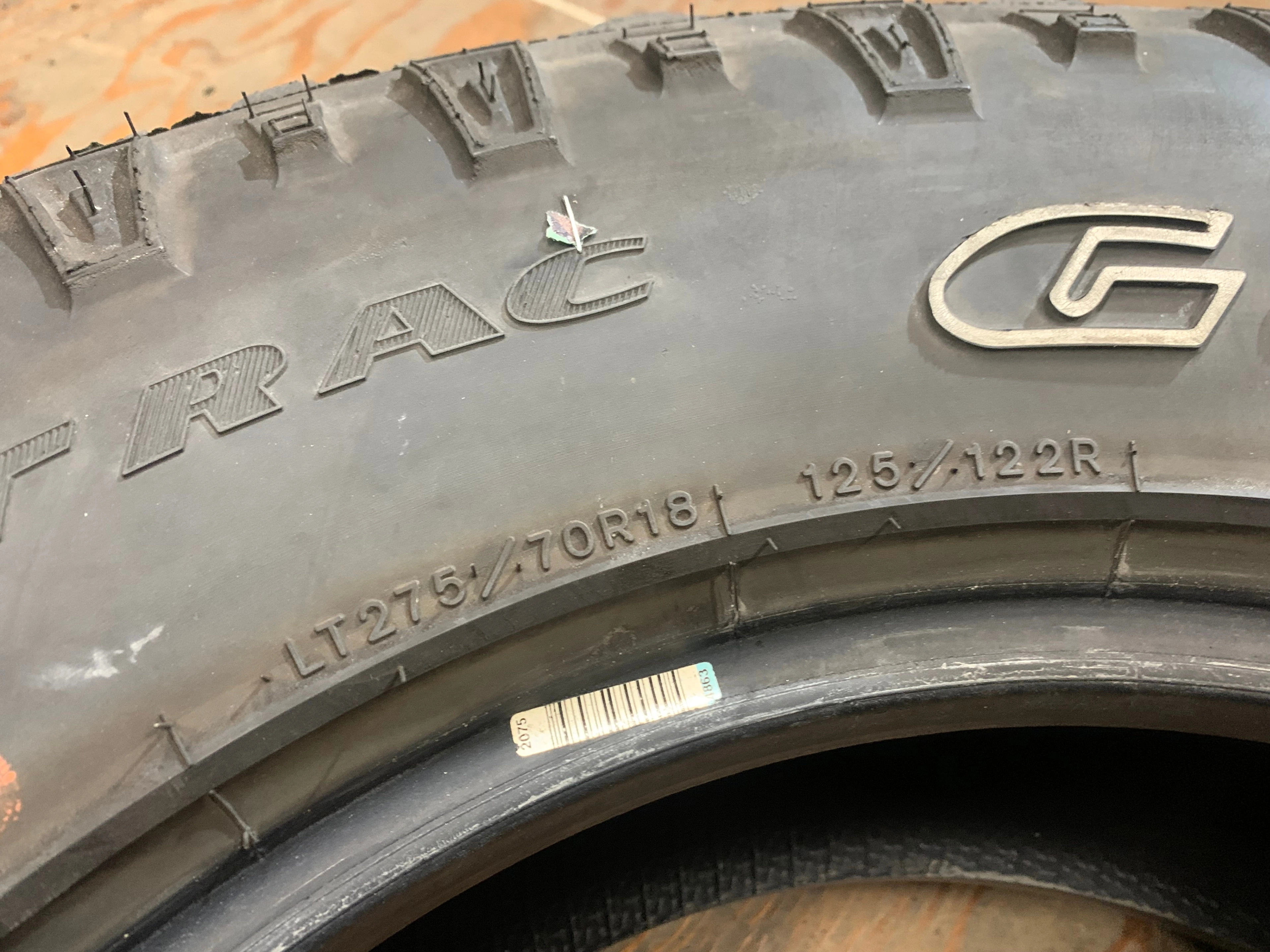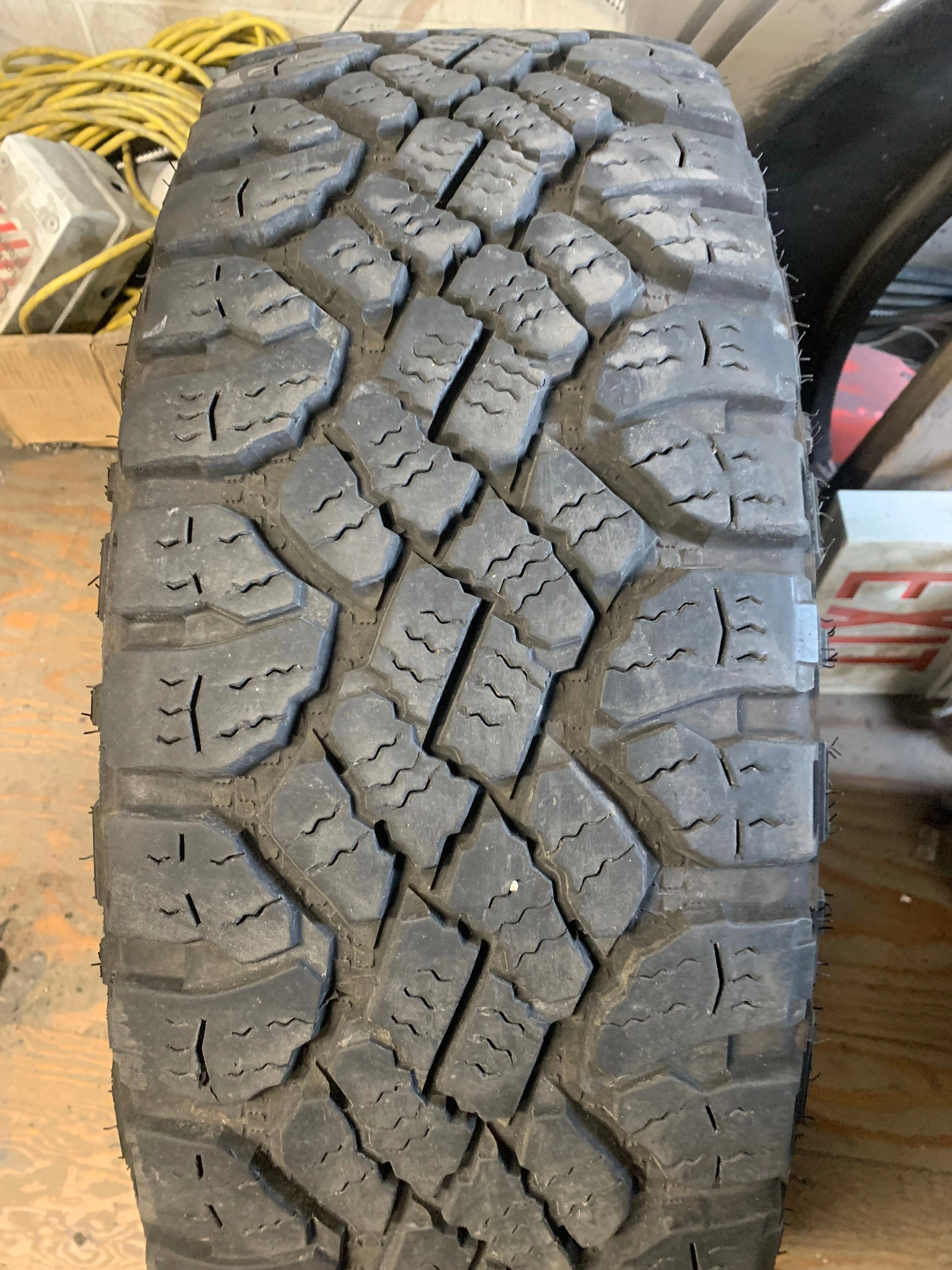 size LT 275/70/18 125/122R Goodyear Wrangler Duratrac with no repairs and 70% tread