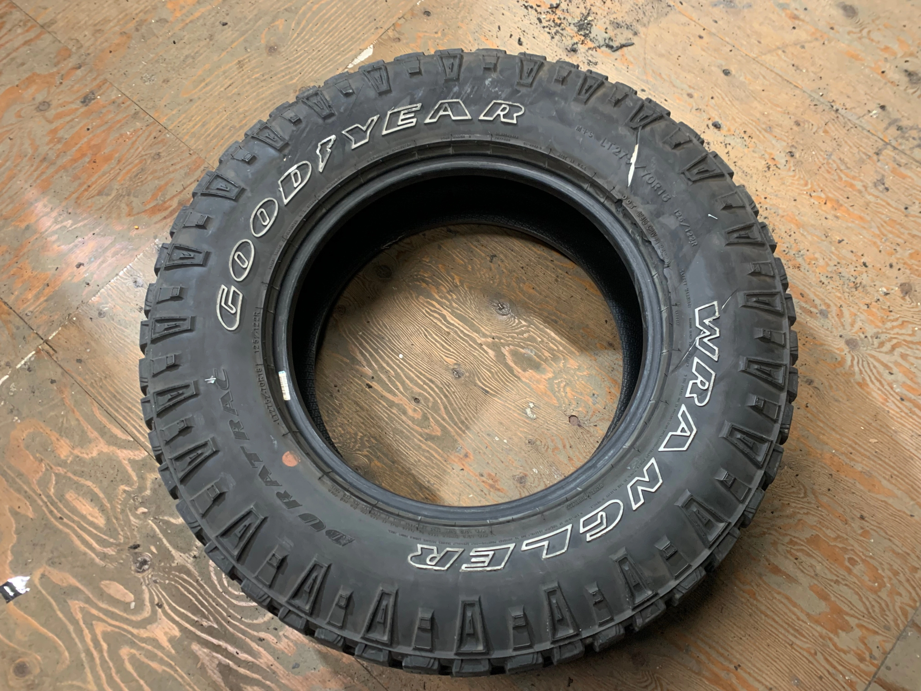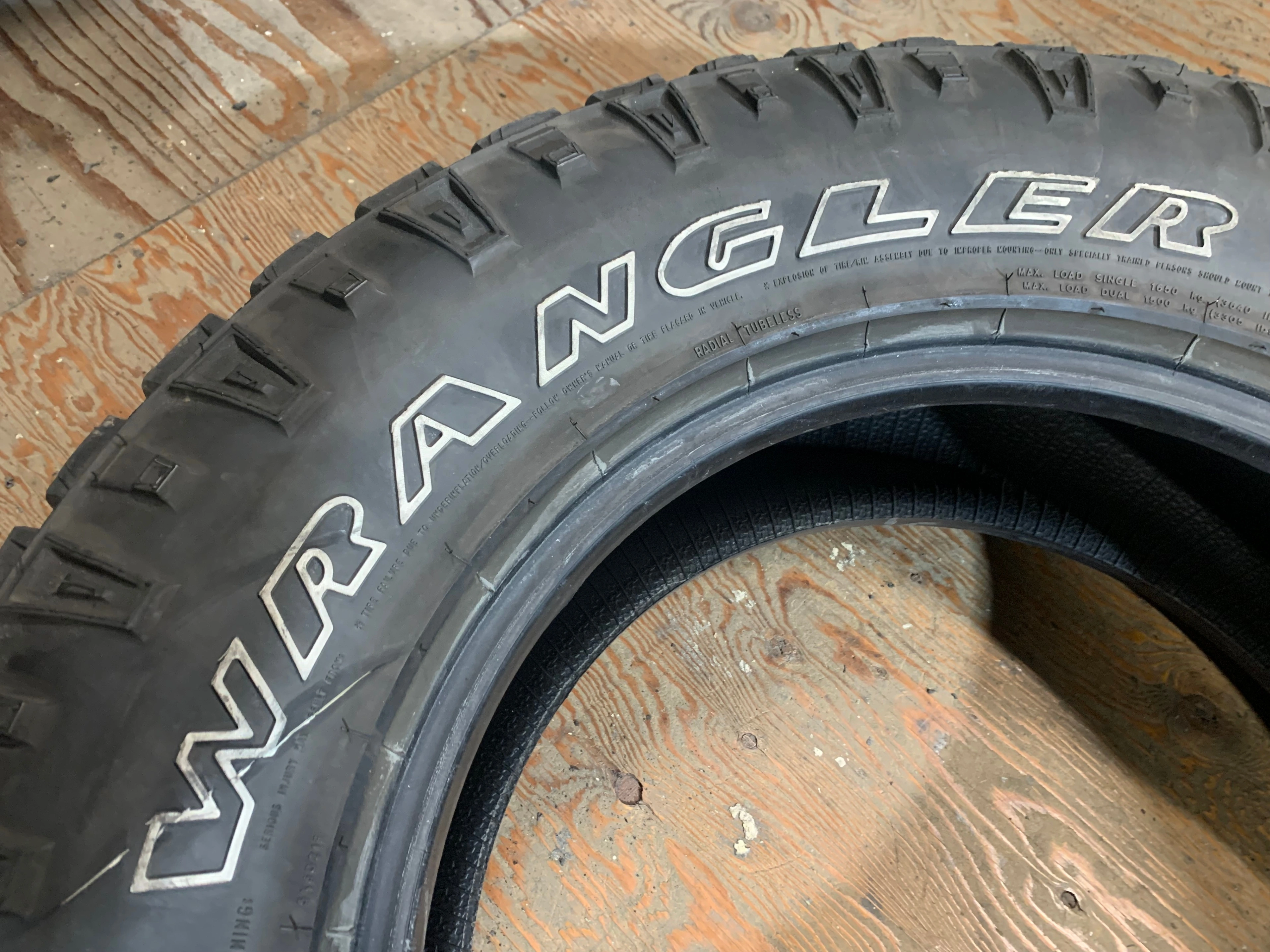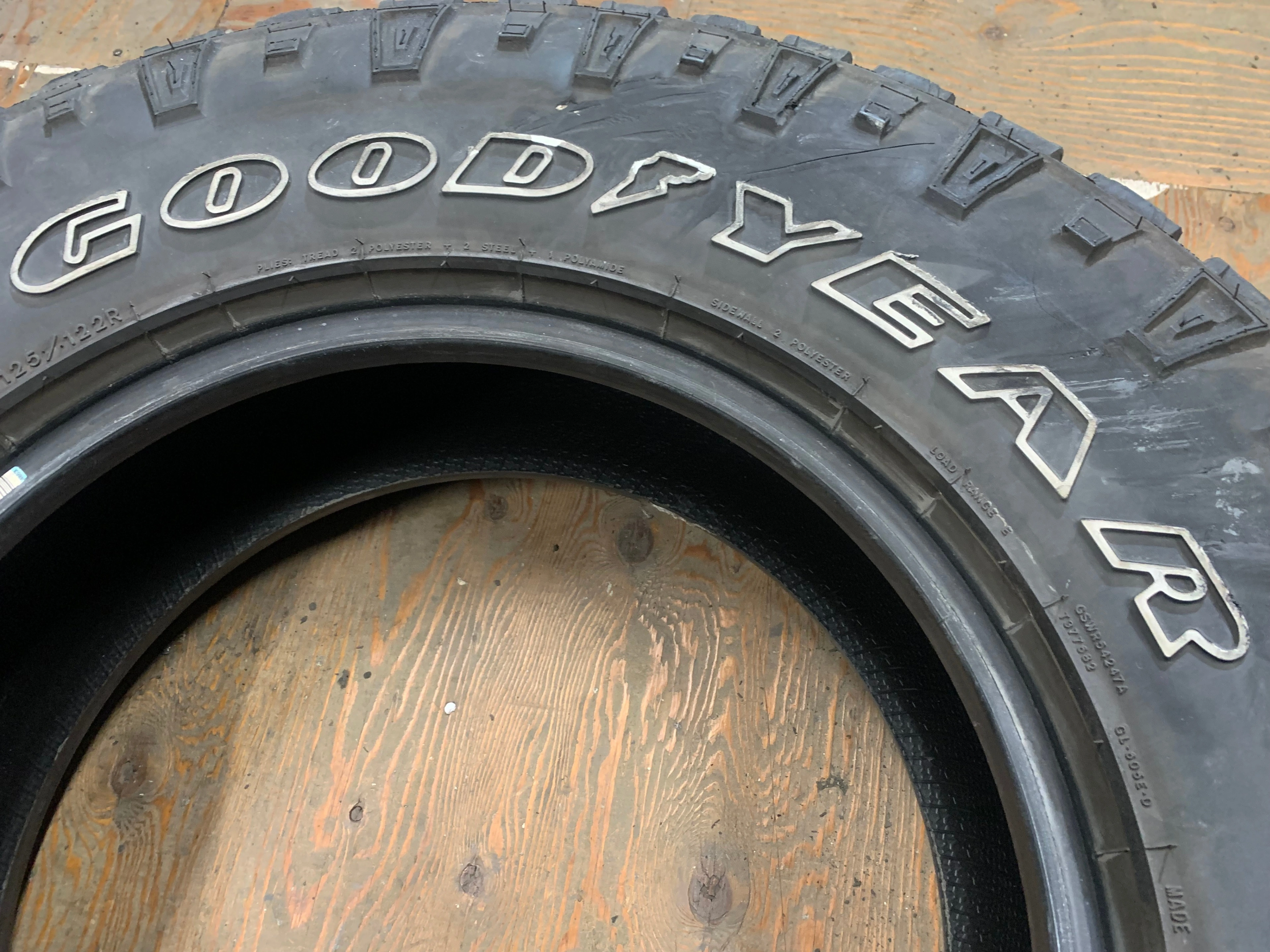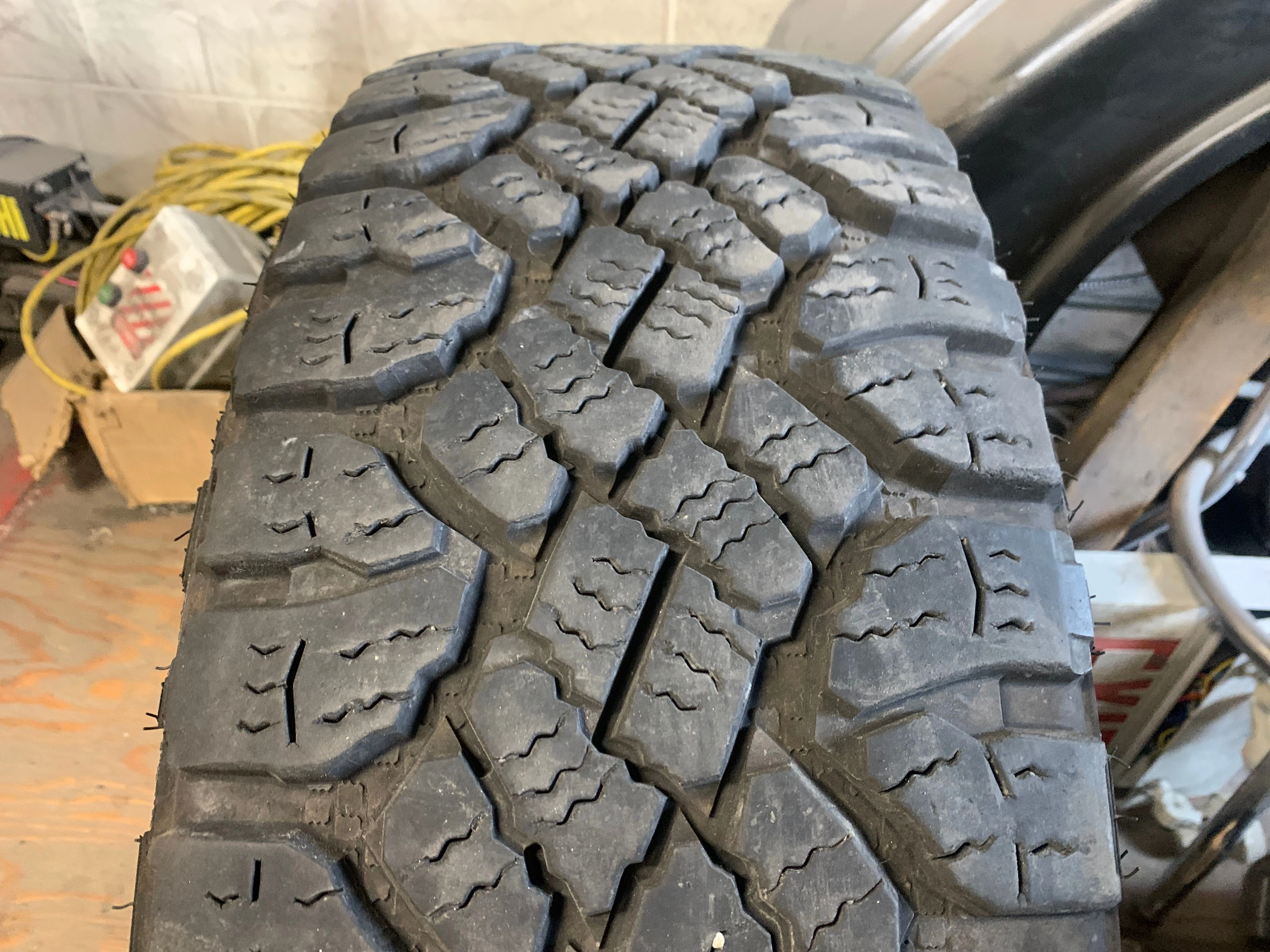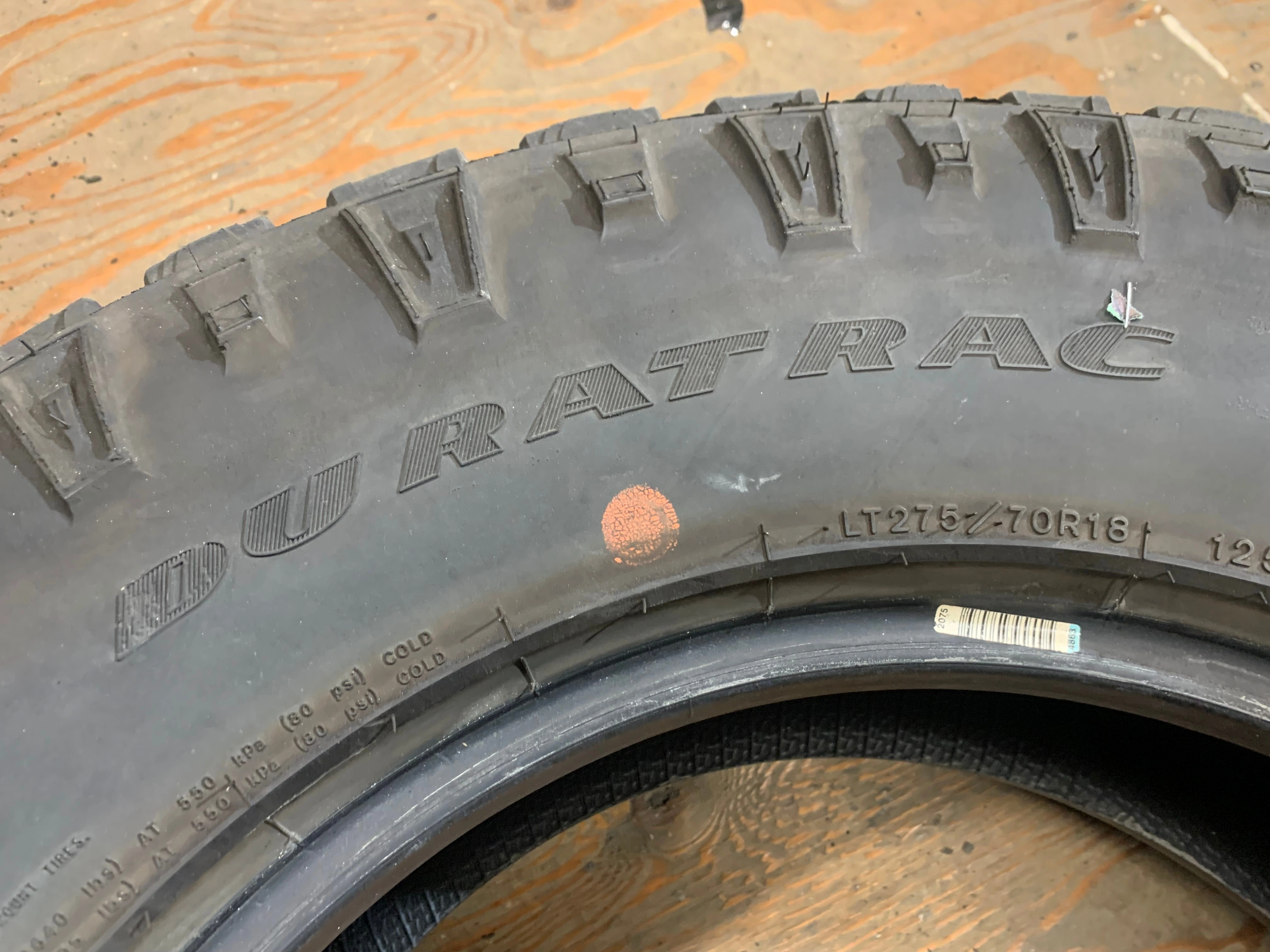 size LT 275/70/18 125/122R Goodyear Wrangler Duratrac with no repairs and 70% tread