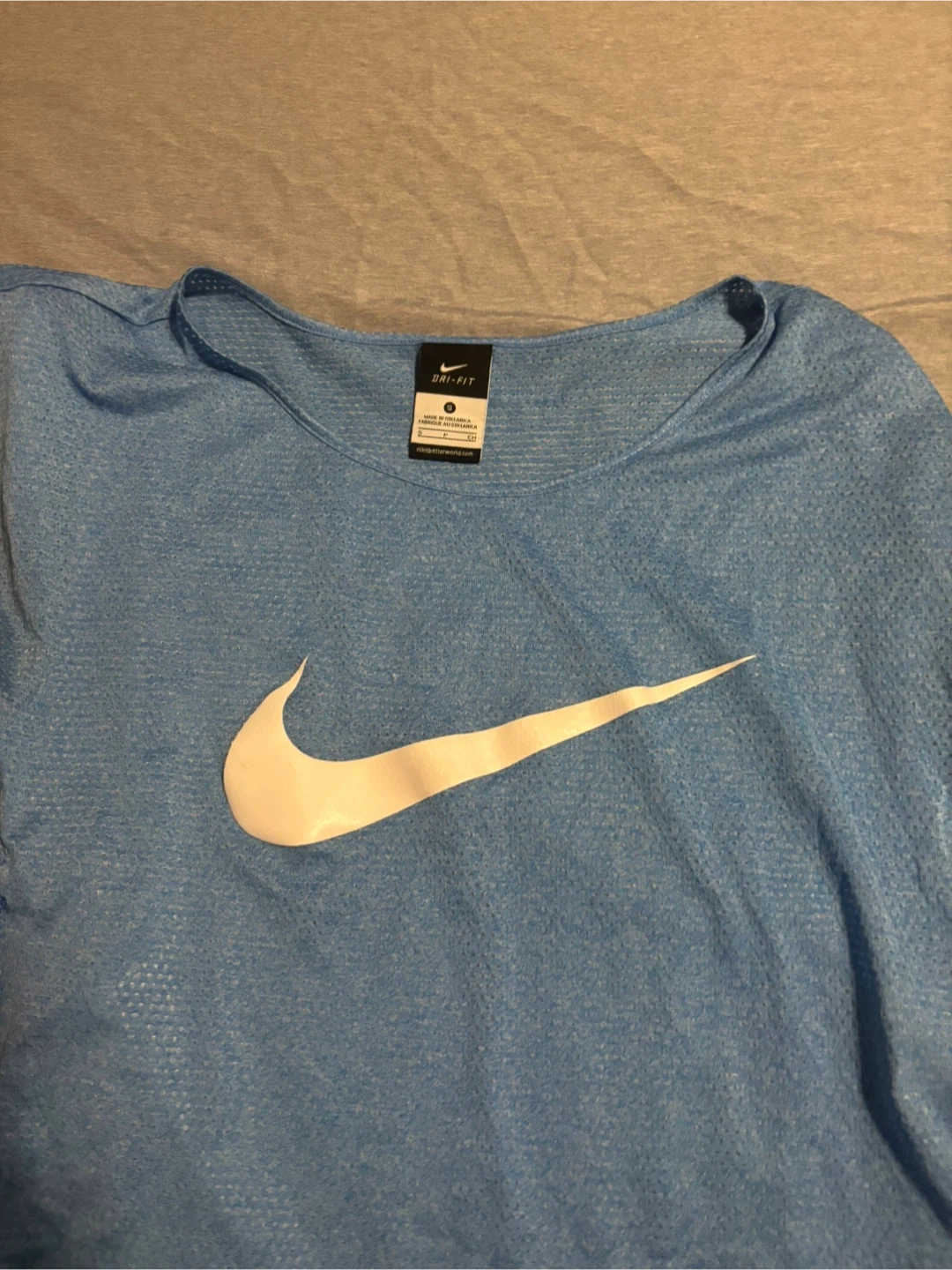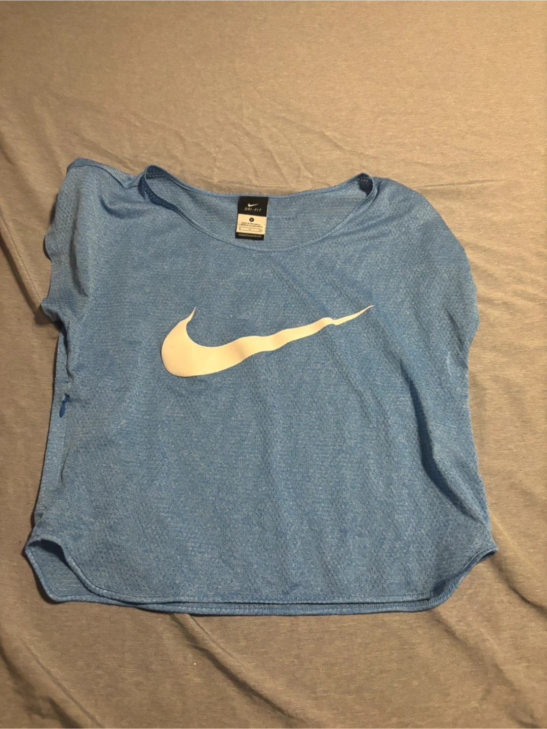 Selling a light blue Nike Dri-FIT top in size small! It's in great condition and perfect for workouts or casual wear. The Dri-FIT material will keep you cool and comfortable. It features the iconic Nike swoosh on the front.