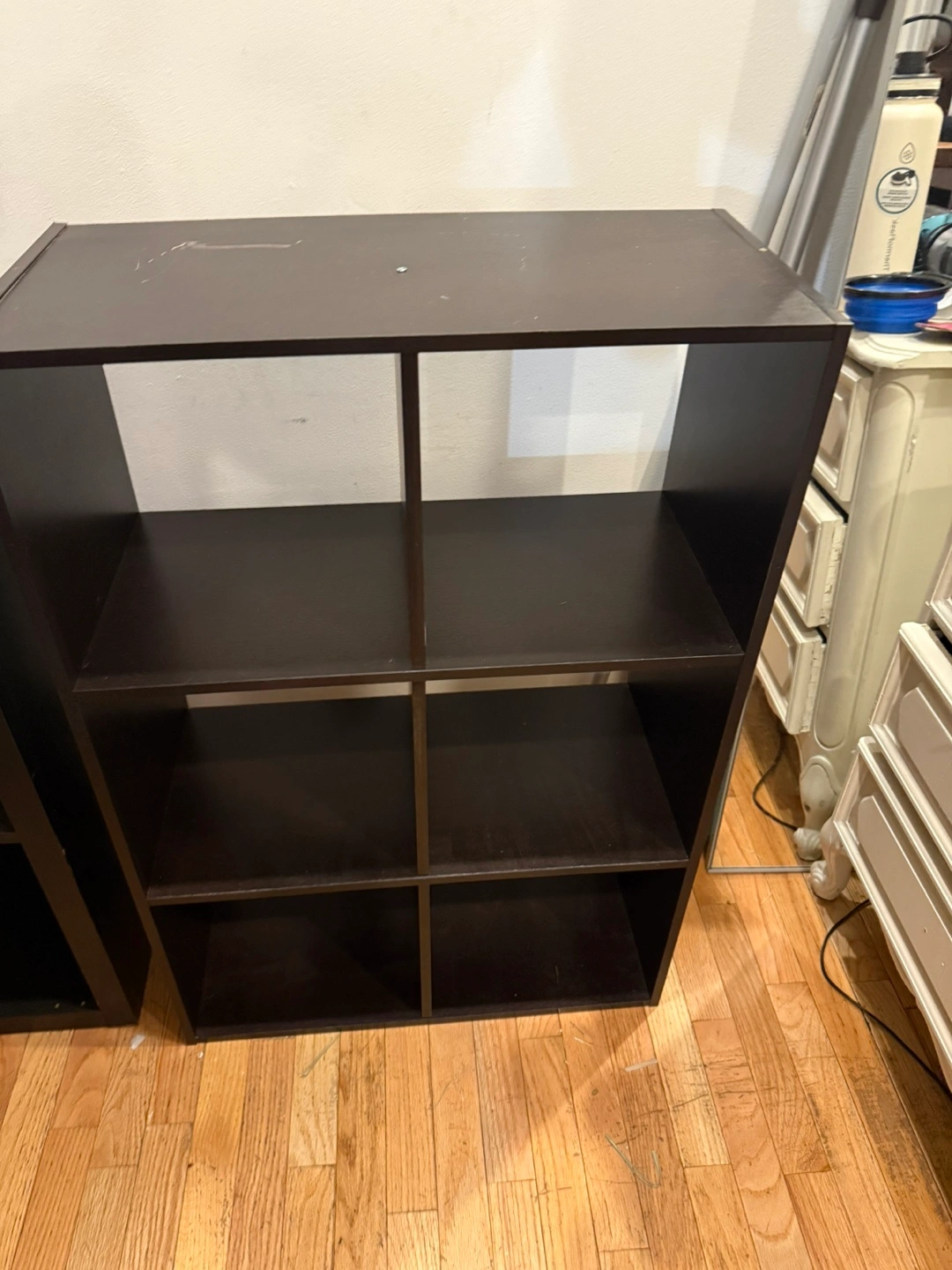 Selling a dark brown storage shelf with 6 cube compartments! It's great for organizing books, toys, or decor. There are some minor scratches on the top surface.