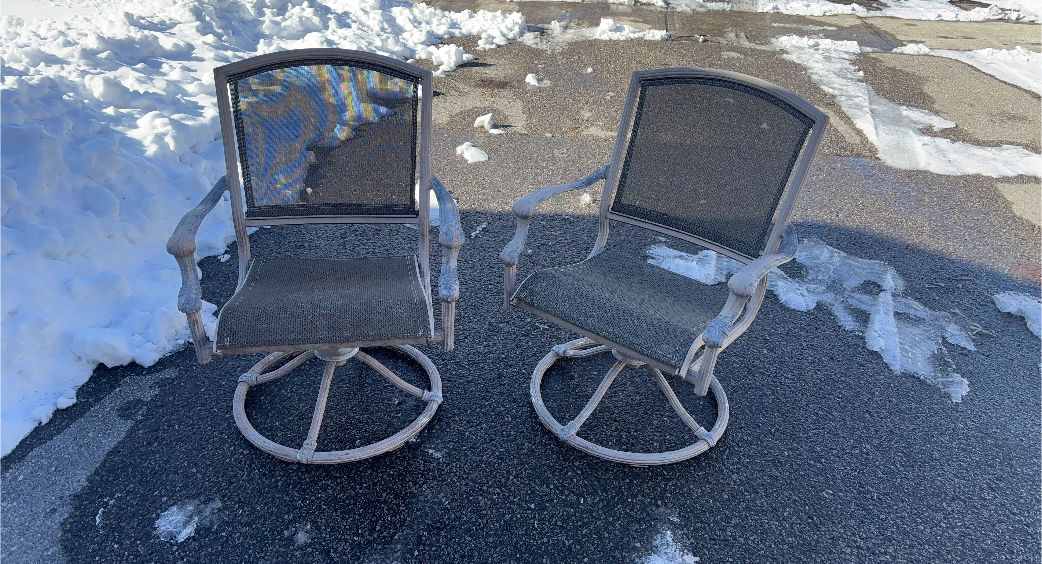 Selling a set of two swivel patio chairs. These chairs feature a durable metal frame with mesh fabric seating. They're perfect for enjoying your outdoor space.