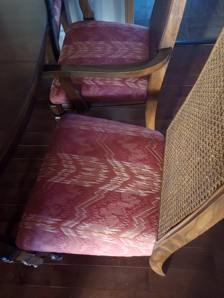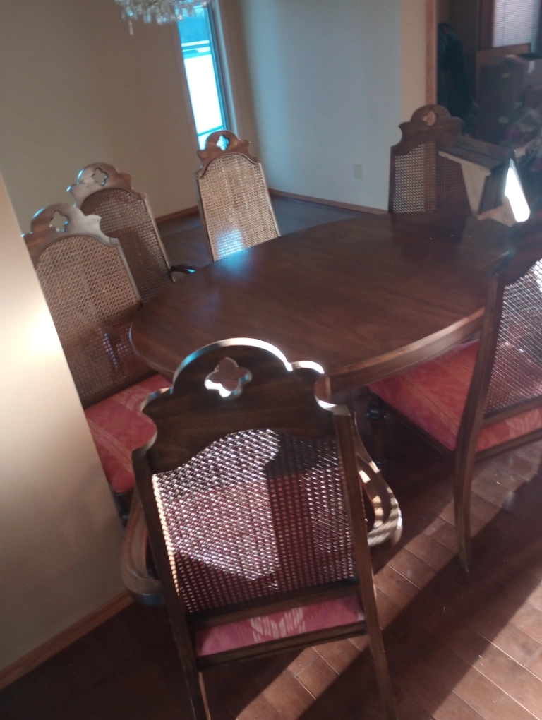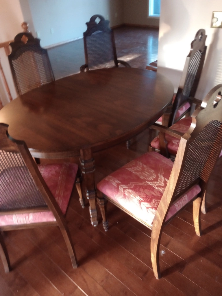 This set includes a round table with a leaf and six chairs with a unique woven cane back and patterned cushions. The table top and chair legs are made of solid wood.