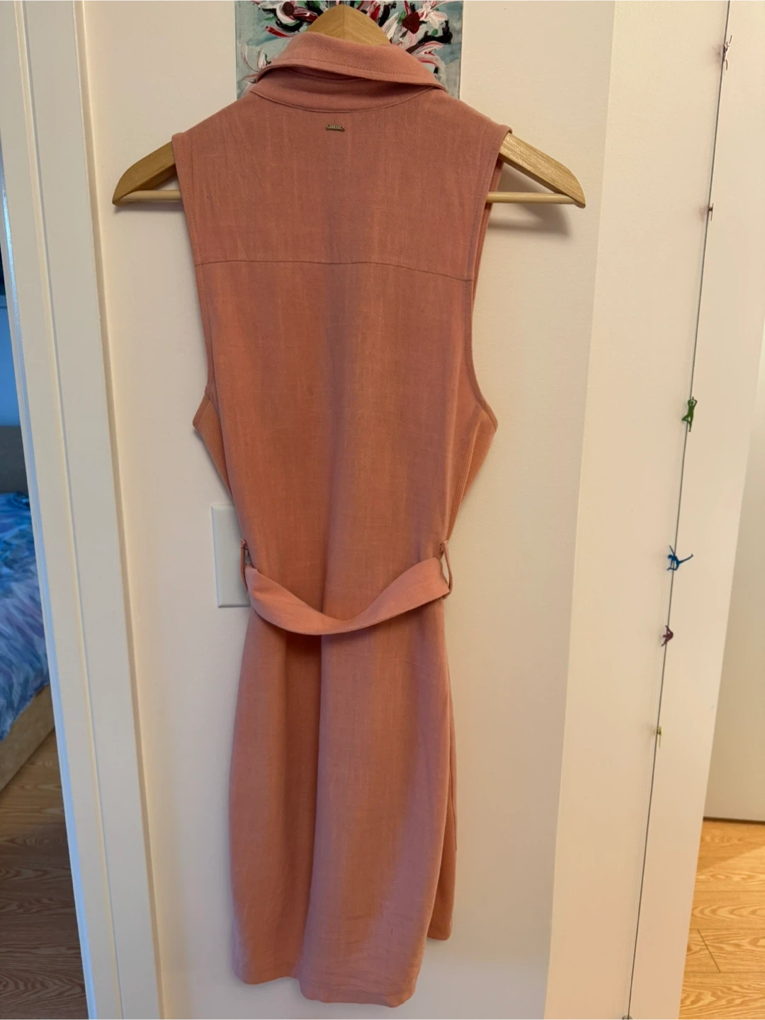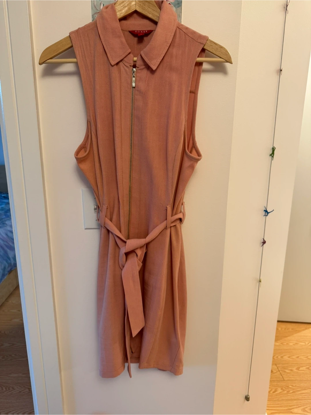 Here's a cute Guess sleeveless dress in a lovely pink colour! It features a zip-up front and a tie around the waist. The size is S.