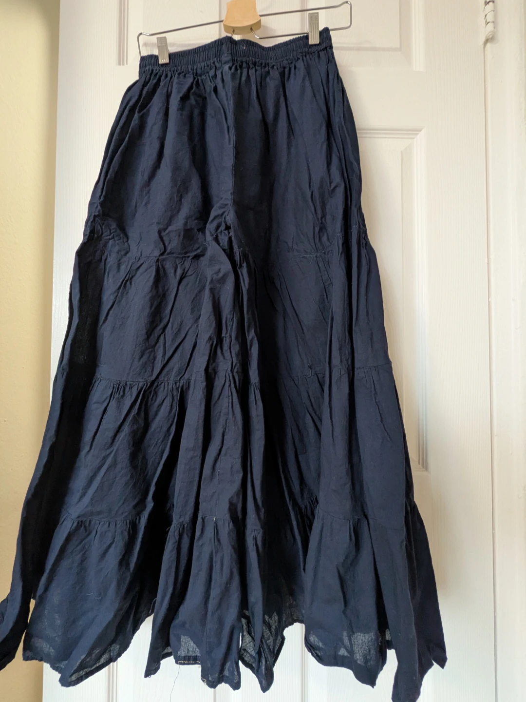 Navy blue tiered wide leg pants with an elastic waistband. These pants offer a relaxed fit and a flowy silhouette. They're made from a lightweight material, perfect for warmer weather.