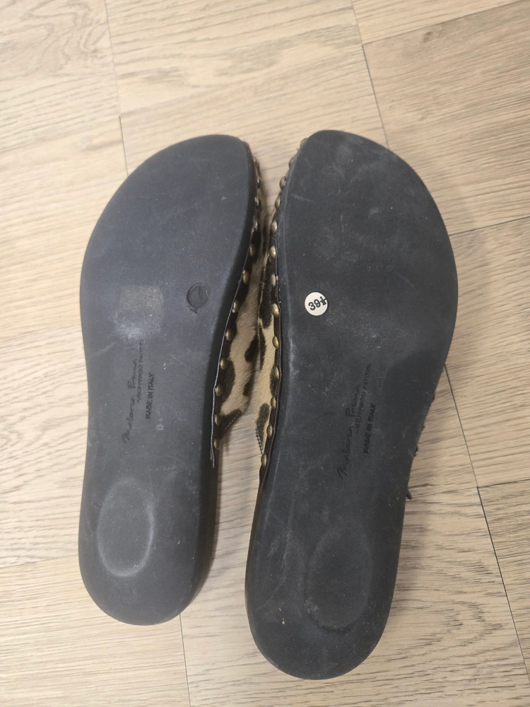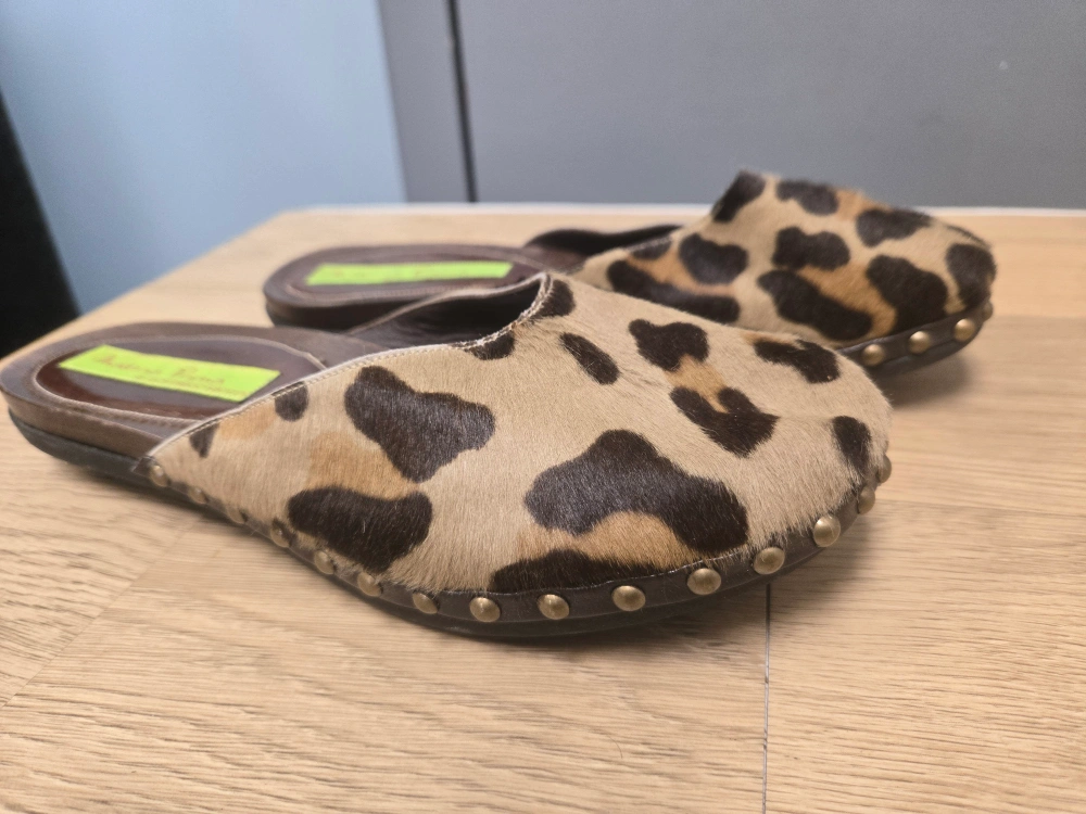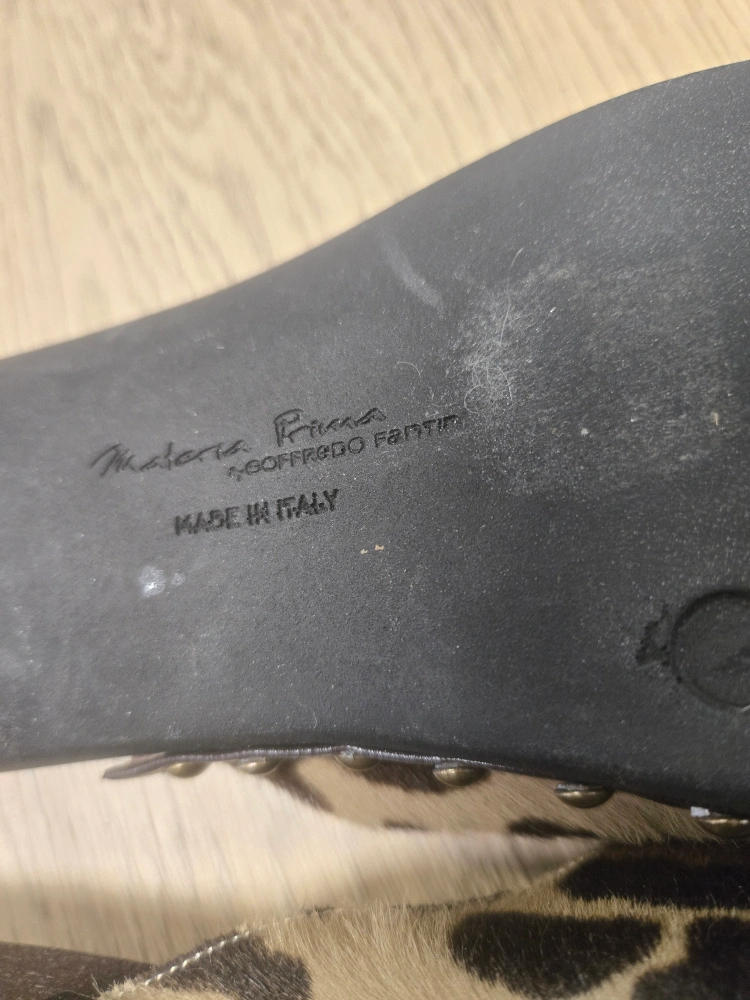 Cute Materia Prima by Goffredo Fantini mules with a fun leopard print! They are a size 39.5 and made in Italy. Perfect for adding a bit of flair to your outfit!