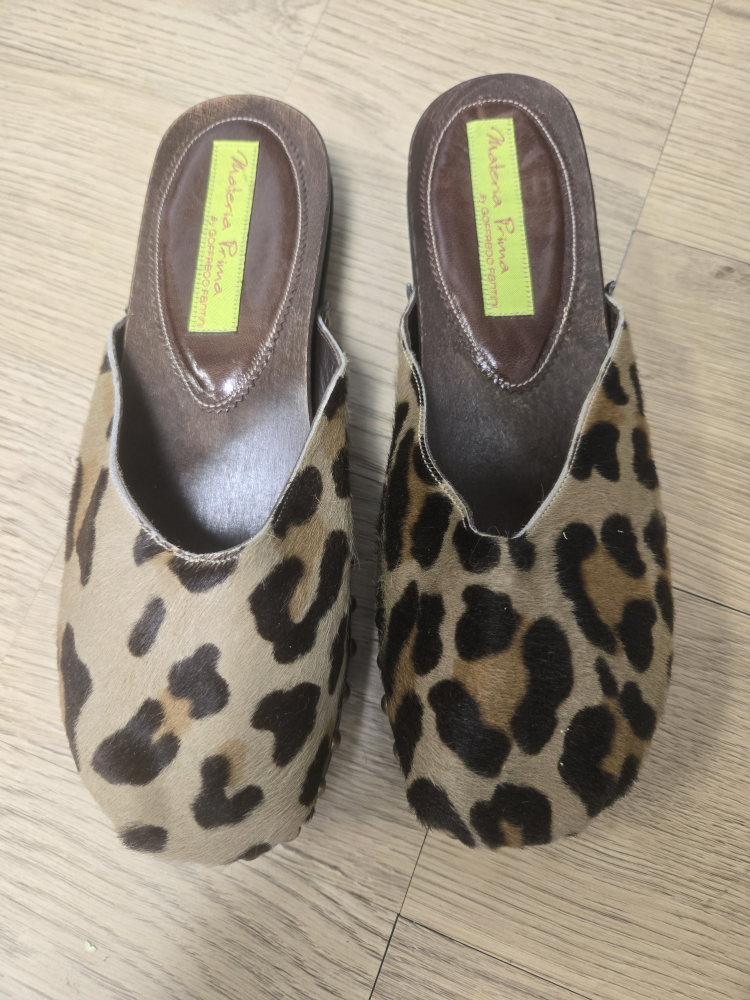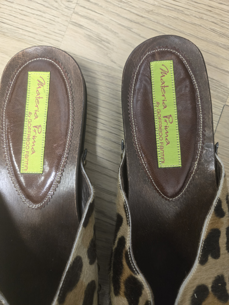 Cute Materia Prima by Goffredo Fantini mules with a fun leopard print! They are a size 39.5 and made in Italy. Perfect for adding a bit of flair to your outfit!
