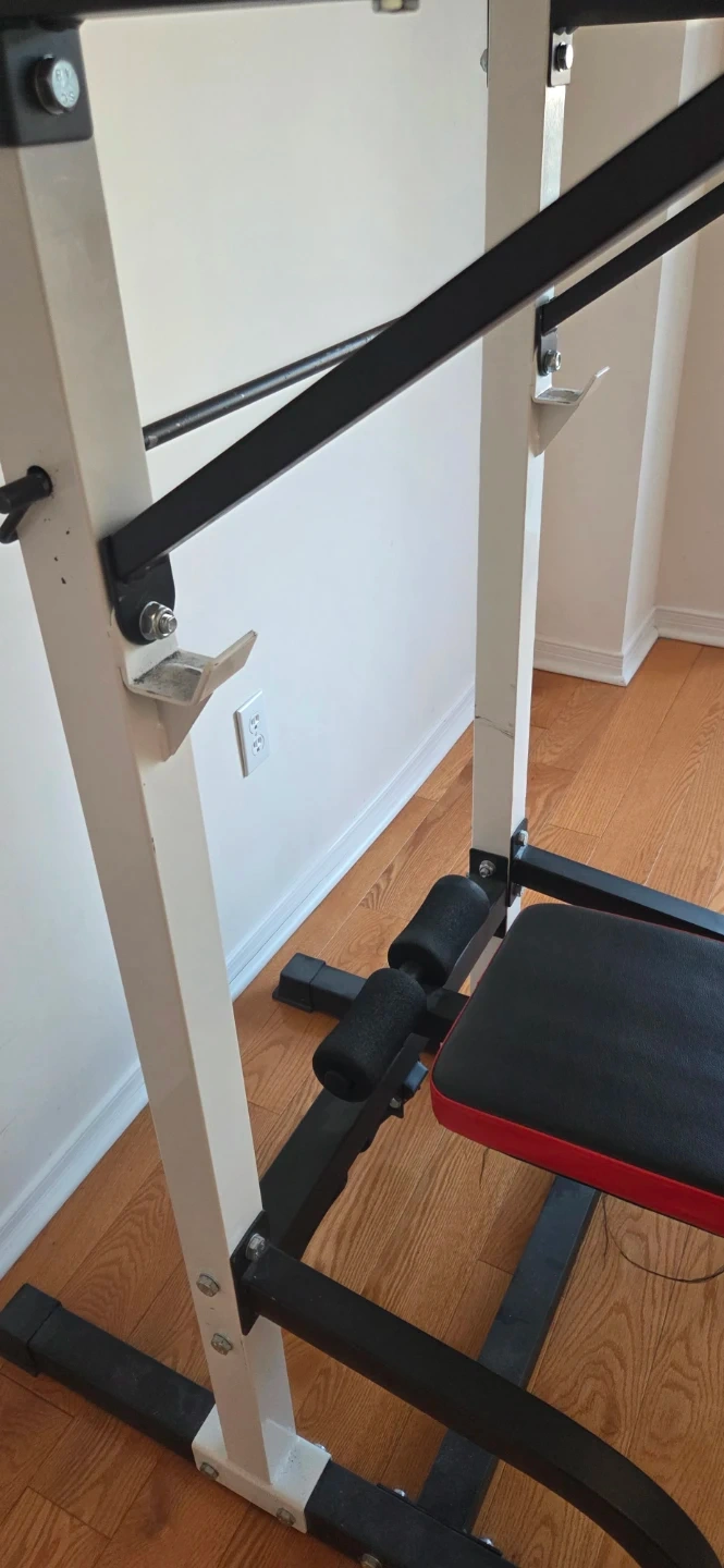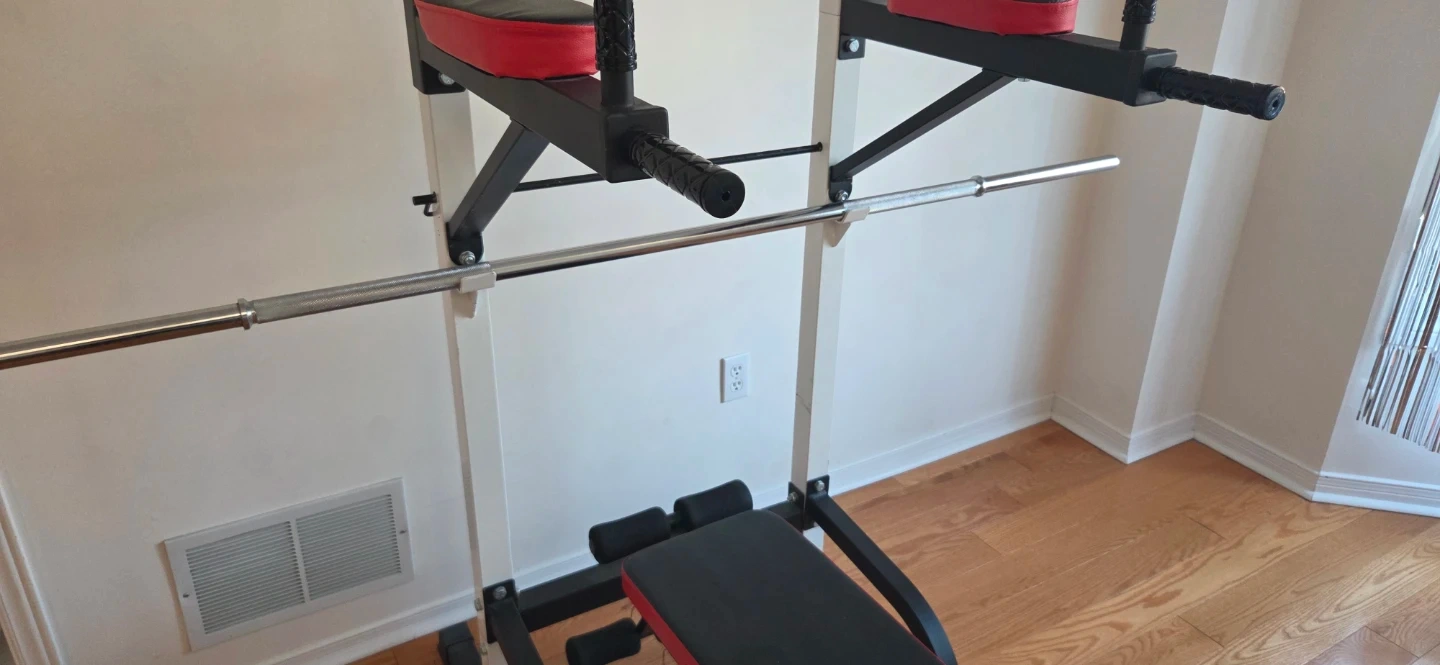 This Wasai power tower features a multi-grip pull-up bar and dip station. It includes a padded bench for exercises. Steel construction with comfortable padding.