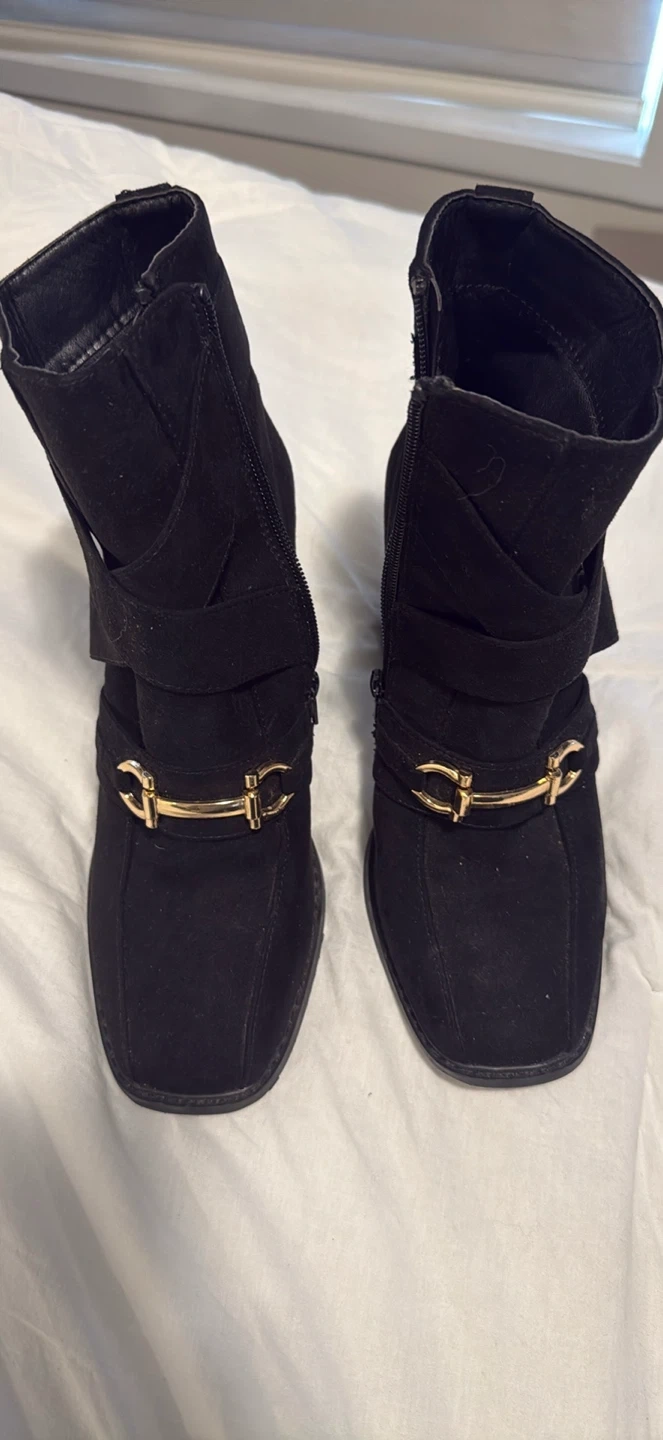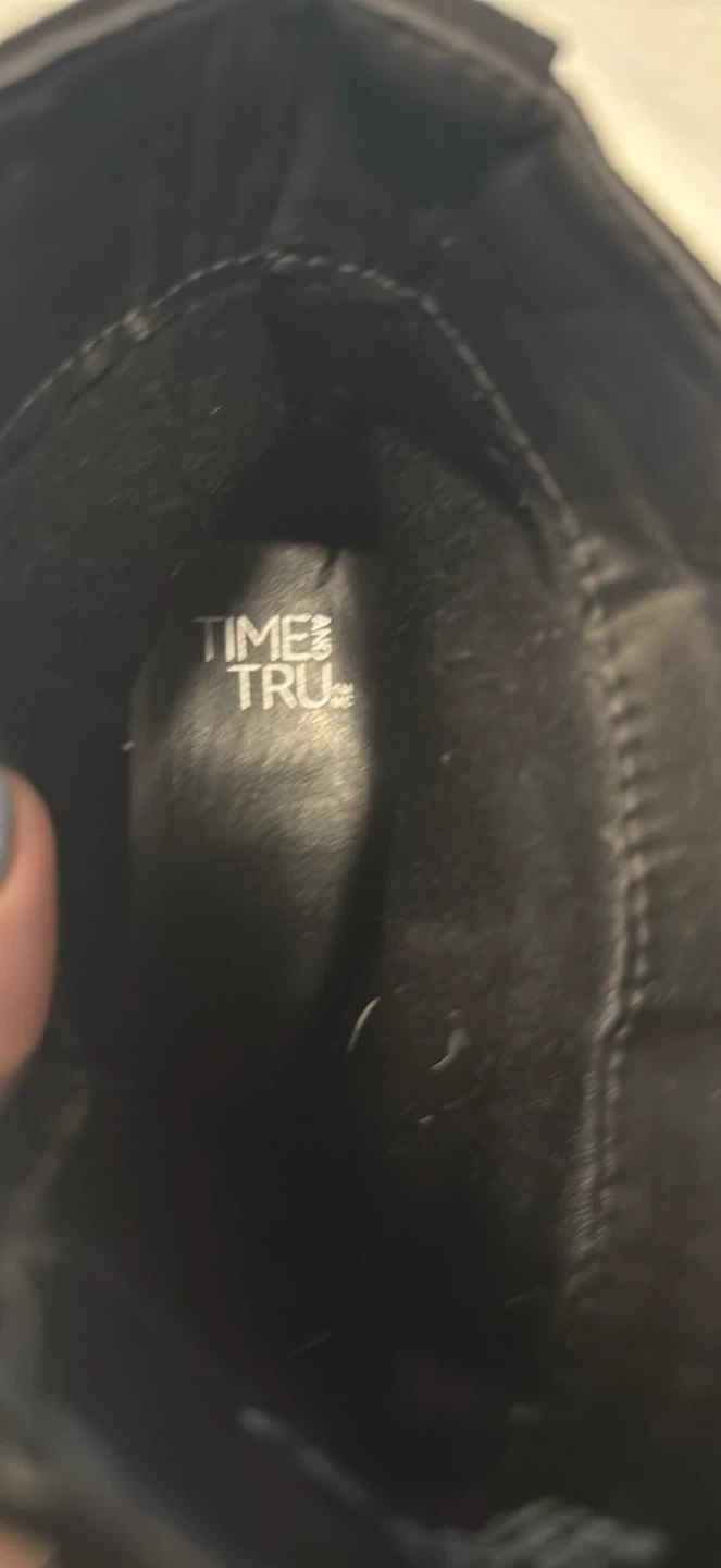 Selling a pair of Time & Tru ankle boots in black. They feature a stylish design with gold-tone hardware. The size is US 8. The manufacturing date on the boots is 2022 March 25