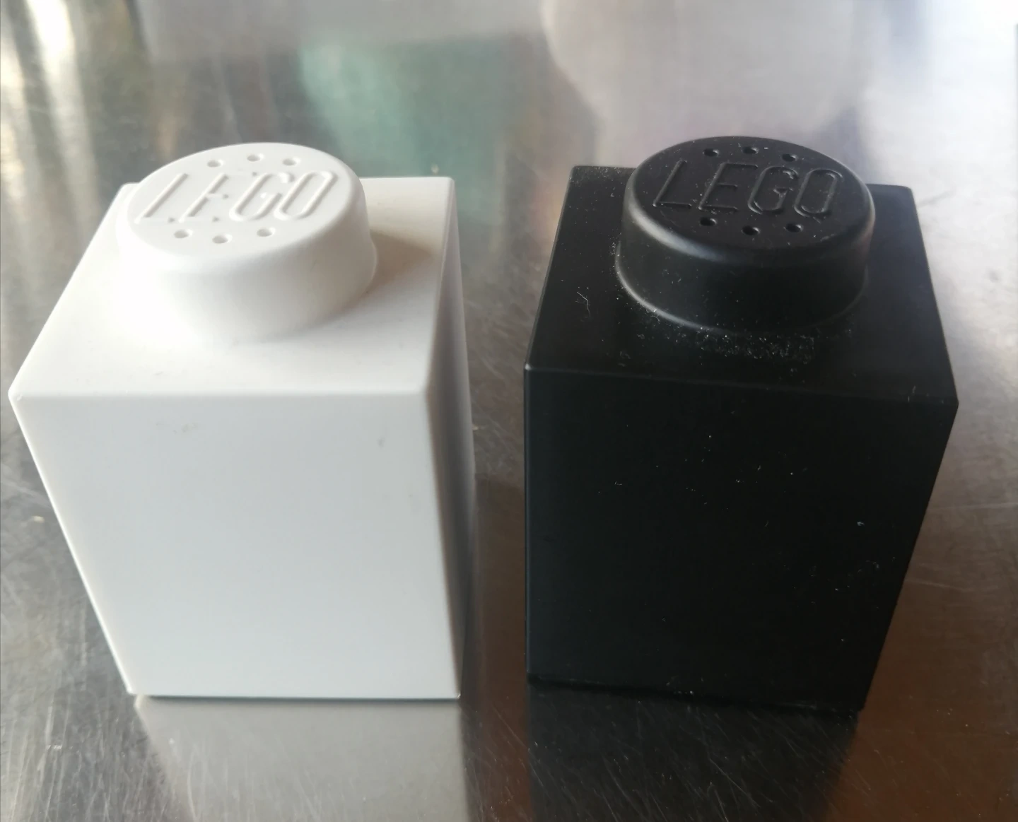 Never used. Pair of LEGO salt and pepper shakers. Black and white. Fun kitchen accessory.