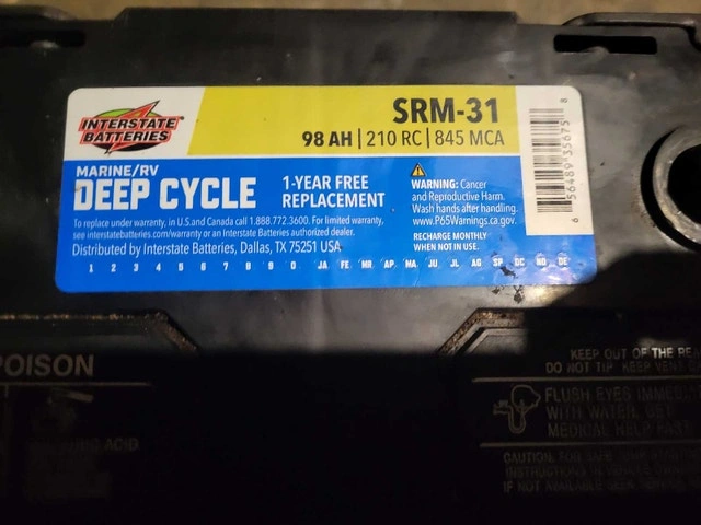 This Interstate Deep Cycle Marine/RV battery, model SRM-31, boasts 98 AH and 210 RC, perfect for your marine or RV needs. This battery has been used, but it is still in good working condition and ready to power your adventures on the water or road. Specifications: Model: SRM-31, Type: Deep Cycle Marine/RV, Amp Hours: 98 AH, Reserve Capacity: 210 RC. I'm asking $175.