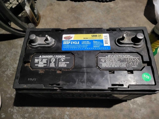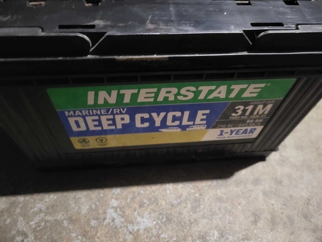 This Interstate Deep Cycle Marine/RV battery, model SRM-31, boasts 98 AH and 210 RC, perfect for your marine or RV needs. This battery has been used, but it is still in good working condition and ready to power your adventures on the water or road. Specifications: Model: SRM-31, Type: Deep Cycle Marine/RV, Amp Hours: 98 AH, Reserve Capacity: 210 RC. I'm asking $175.