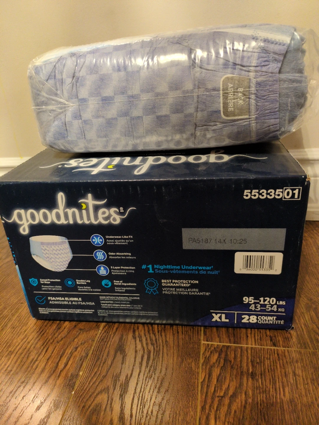 GoodNites nighttime underwear for boys in XL size. These offer 5-layer protection and are odor absorbing. They are designed for 95-120 lbs and 43-54 kg.
