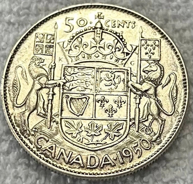 I am selling a 1950 Canadian 50 cent coin. The coin is made of .80% silver and is in used condition. A great addition to any coin collection! Cash accepted, Cashless payment.