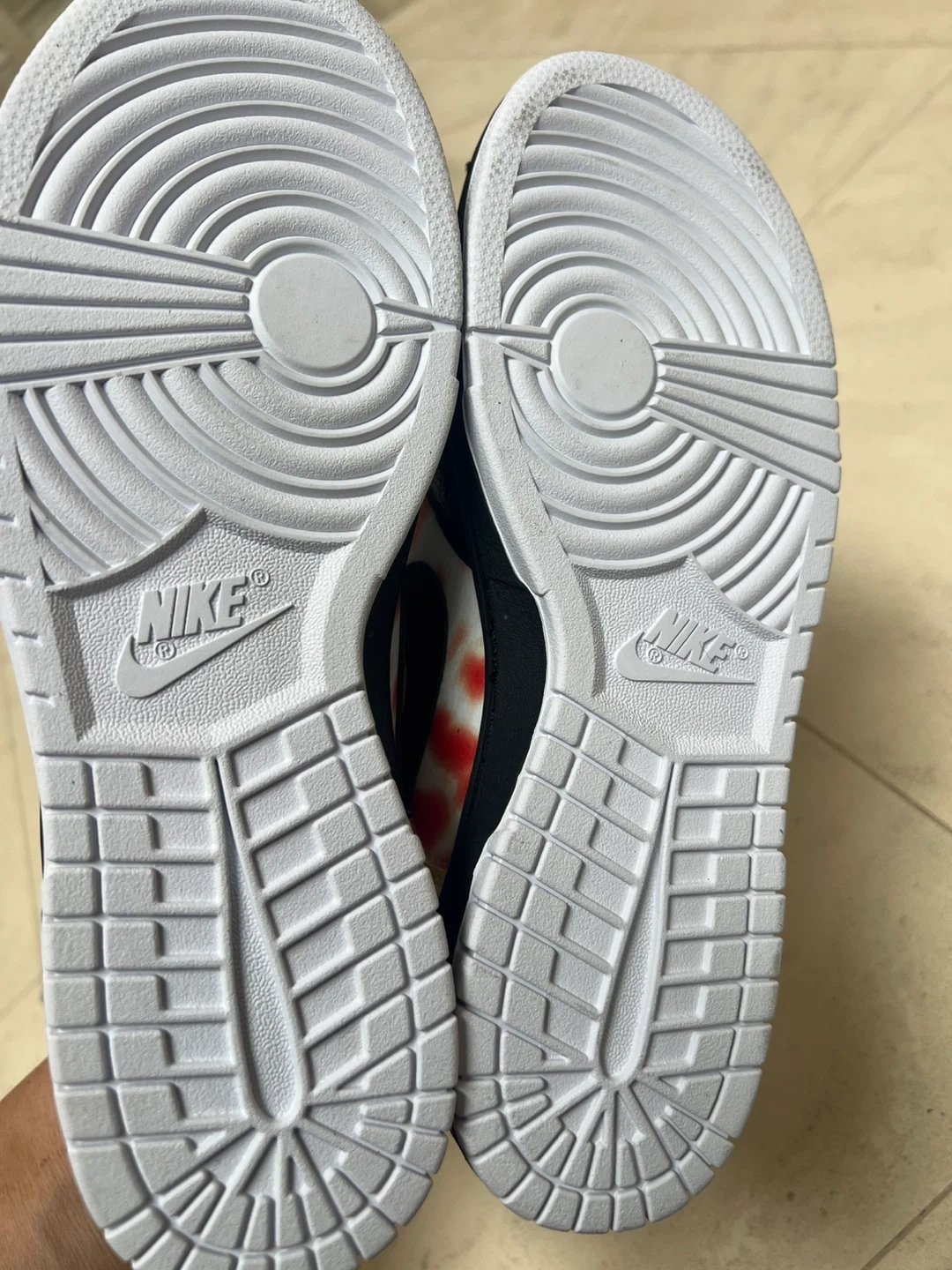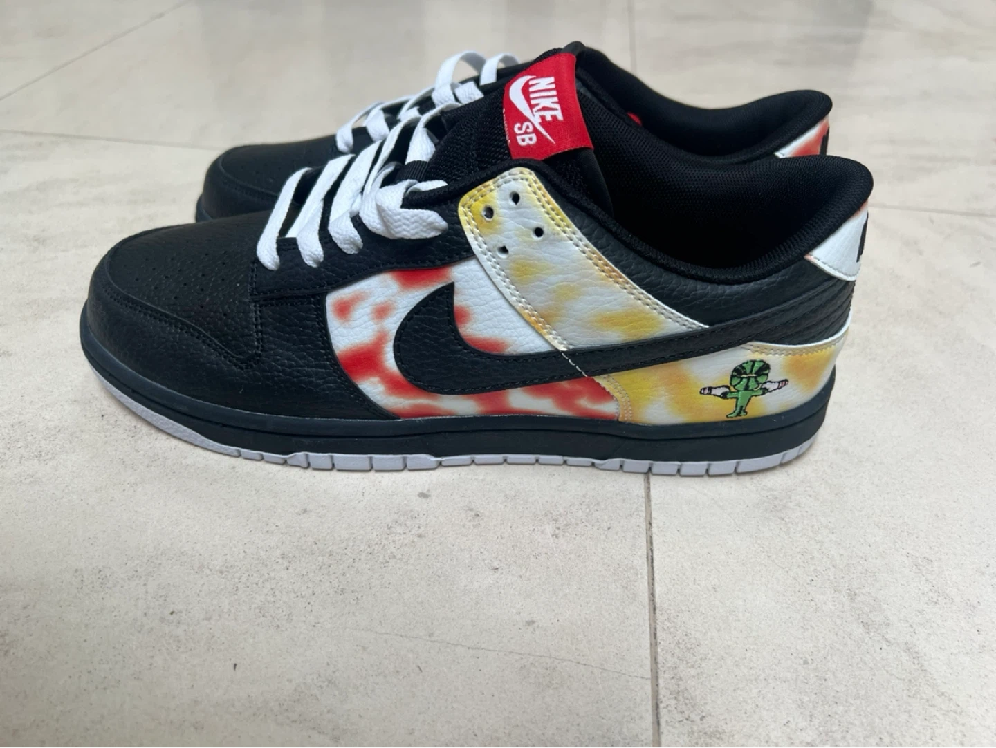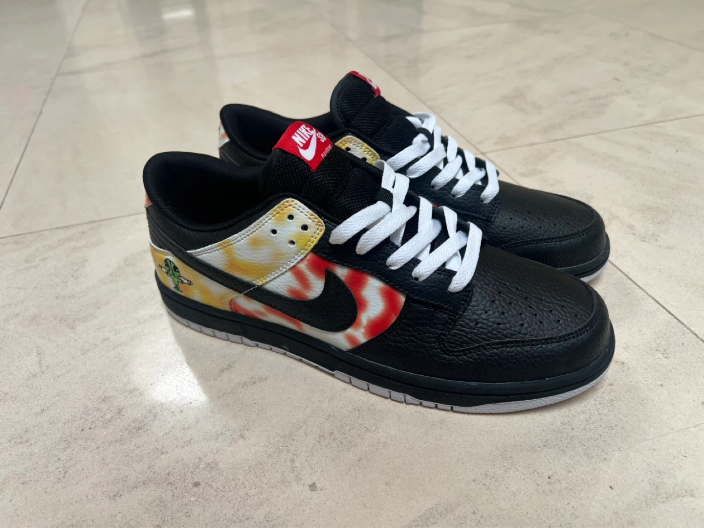 These Nike SB Dunk Low shoes come in a black base with a tie-dye accent on the heel and side panel. They feature a Zoom Air unit for cushioning. A fun graphic of a small green alien is visible on the outer side of the heel.