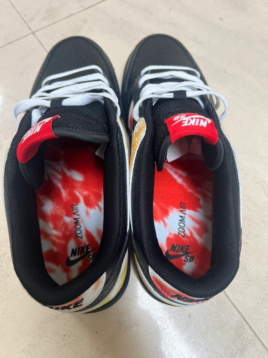 These Nike SB Dunk Low shoes come in a black base with a tie-dye accent on the heel and side panel. They feature a Zoom Air unit for cushioning. A fun graphic of a small green alien is visible on the outer side of the heel.