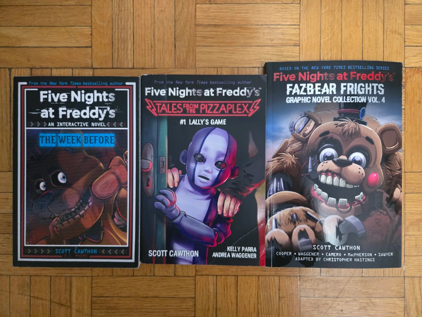 Three books from the popular Five Nights at Freddy's series. Includes 'The Week Before' - $8, 'Tales from the Pizzaplex #1 Lally's Game' - $5, and 'Fazbear Frights Graphic Novel Collection Vol. 4' - $12. These are novels and graphic novel collections for fans of the franchise.