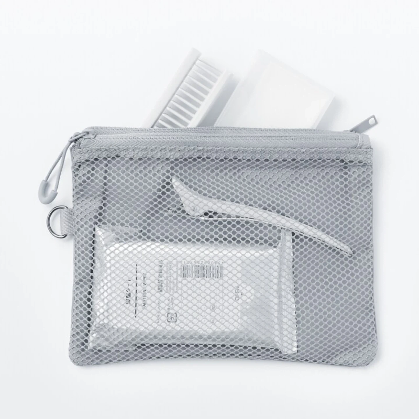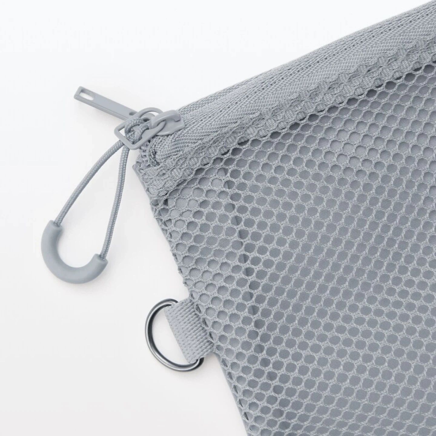 Grey mesh pouch with a zipper closure. It features a compact design with a dual-zipper opening. Ideal for organizing small items or travel essentials.
