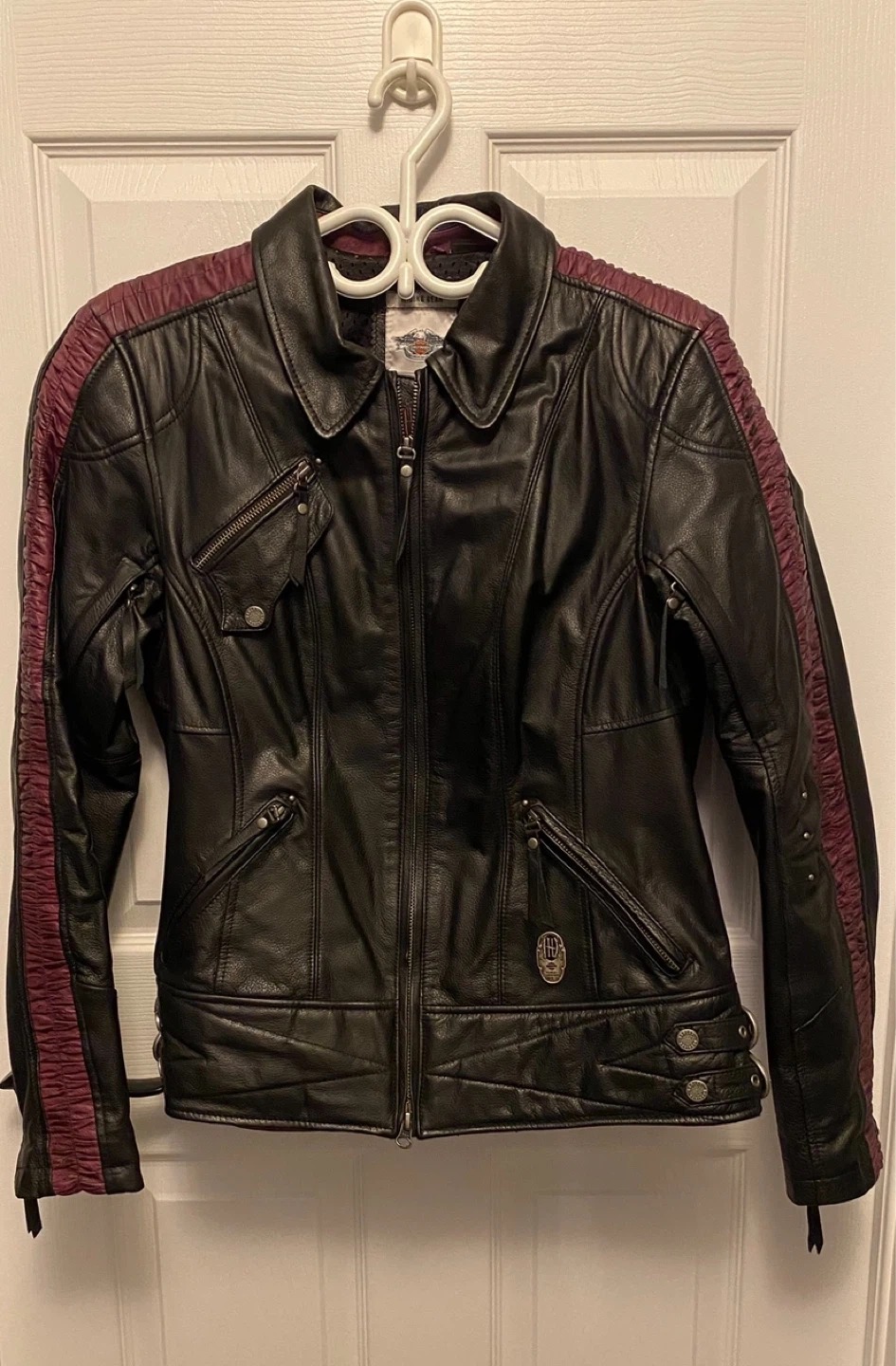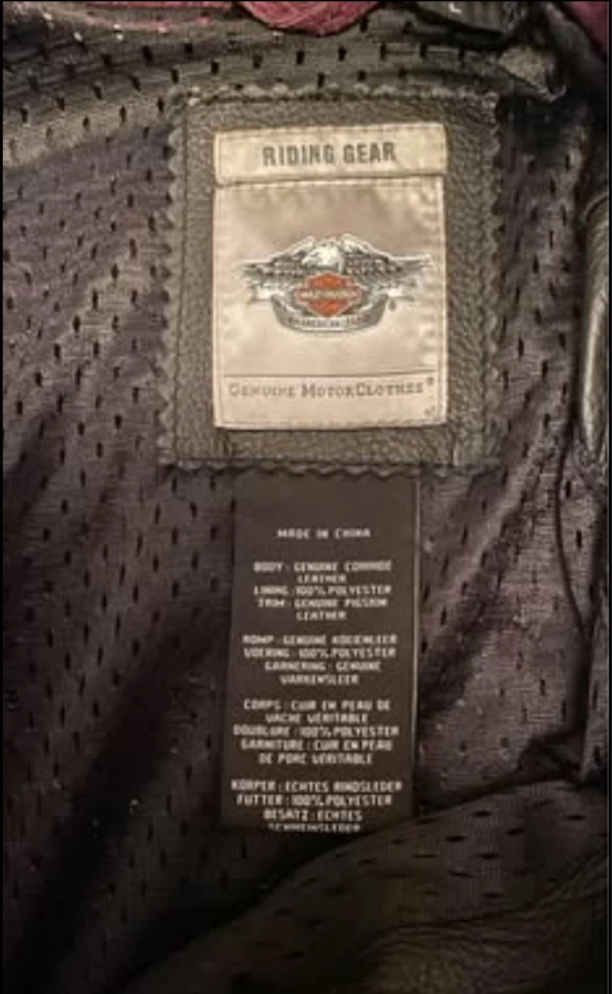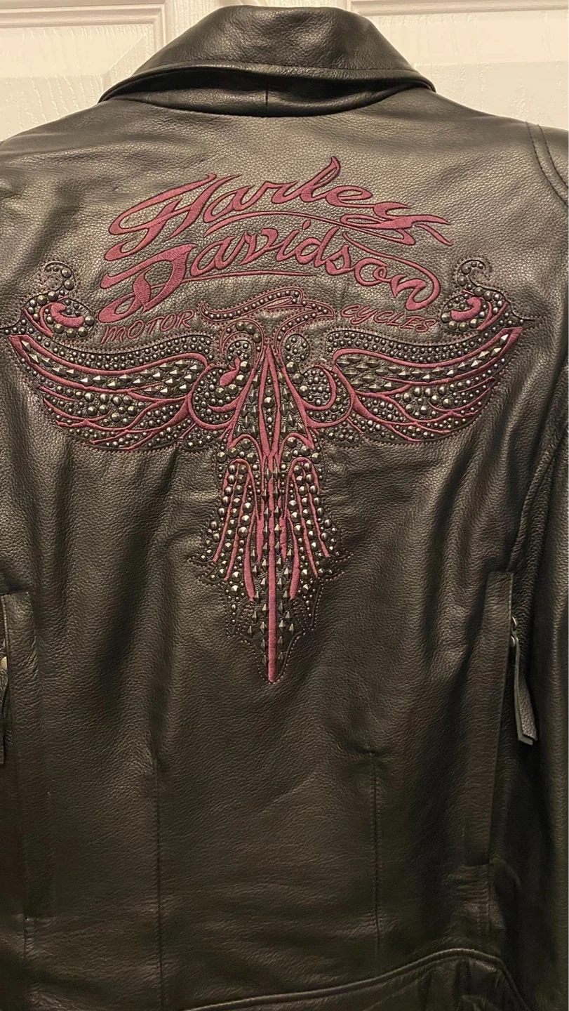 This is a classic black leather motorcycle jacket from Harley-Davidson. It's made with genuine leather and features a stylish embroidered eagle design on the back with accents and studs. The lining is 100% polyester. It's perfect for any rider who wants to look good on and off the road!