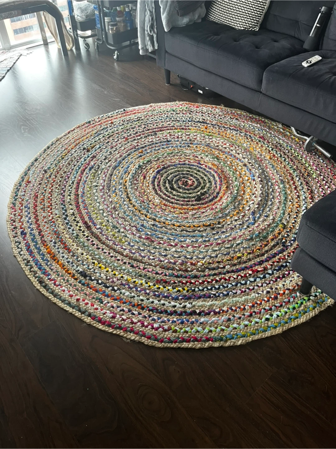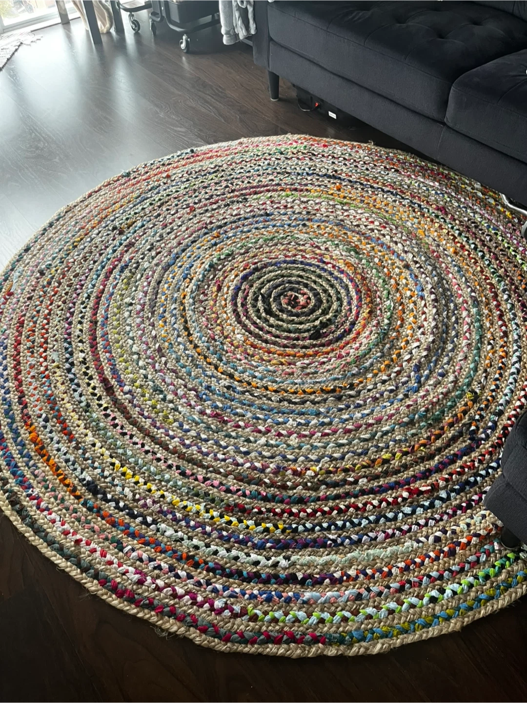 99This is a braided round jute rug that would be perfect for any room! It features a beautiful multi-colour design. It's in great condition and ready for a new home! Serious inquiries only.