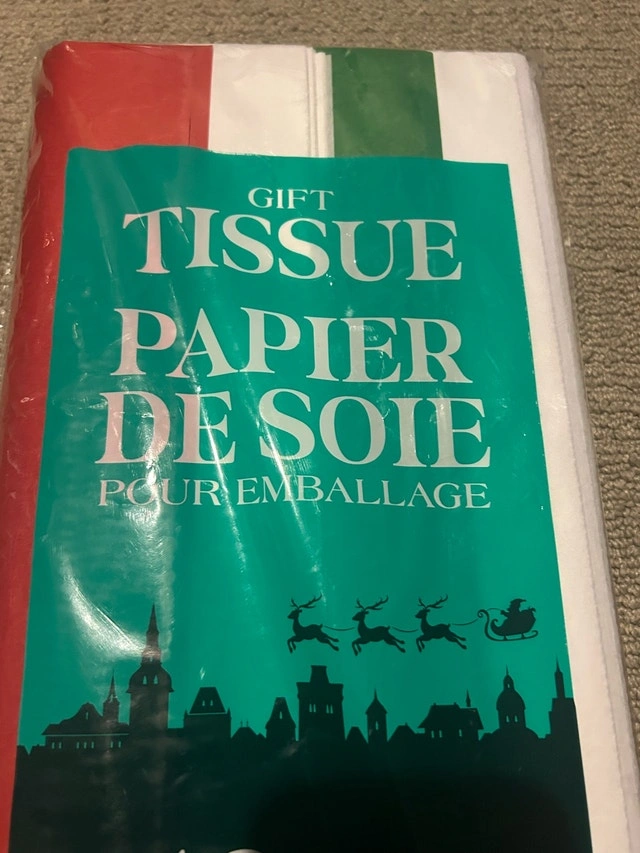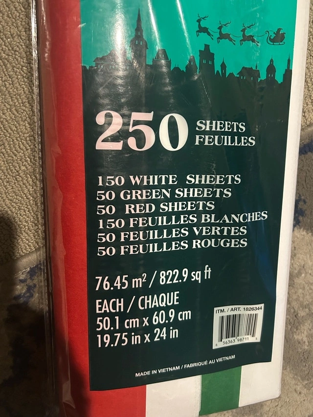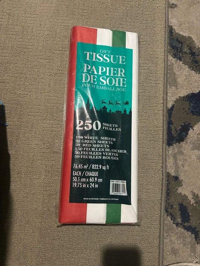 298Brand new pack of 250 sheets of gift tissue paper! Perfect for adding a festive touch to your presents or crafting projects. The package includes 150 white sheets, 50 green sheets, and 50 red sheets, giving you a versatile palette for any occasion. Each sheet measures 50.1 cm x 60.9 cm (19.75 in x 24 in), providing ample coverage for various wrapping needs. Specifications: * Total Sheets: 250 * White Sheets: 150 * Green Sheets: 50 * Red Sheets: 50 * Sheet Size: 50.1 cm x 60.9 cm (19.75 in x 24 in) * Total Area: 76.45 m² / 822.9 sq ft If the ad is up, it's available! Remember to check out my other ads. Discount available for multiple purchases!