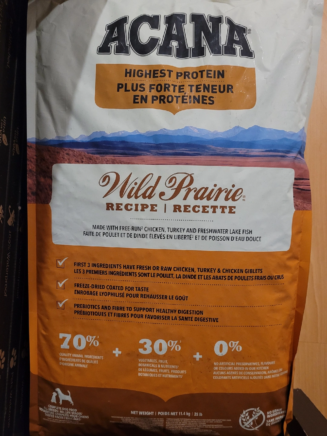 Acana Wild Prarie premium high protein dog food. 25lb full unopened bag $100