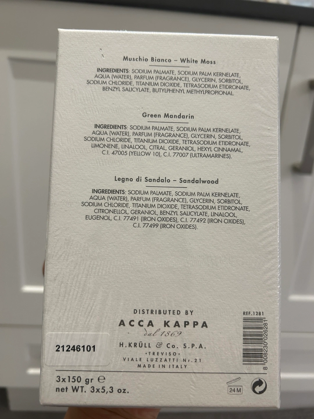 Selling a brand new Acca Kappa Soap Collection set! This set includes three lovely scents: White Moss, Green Mandarin, and Sandalwood. ************************************** The set comes in its original packaging. ************************************** Originally bought for $50 CAD + TAX, it's a great treat for yourself or a thoughtful gift