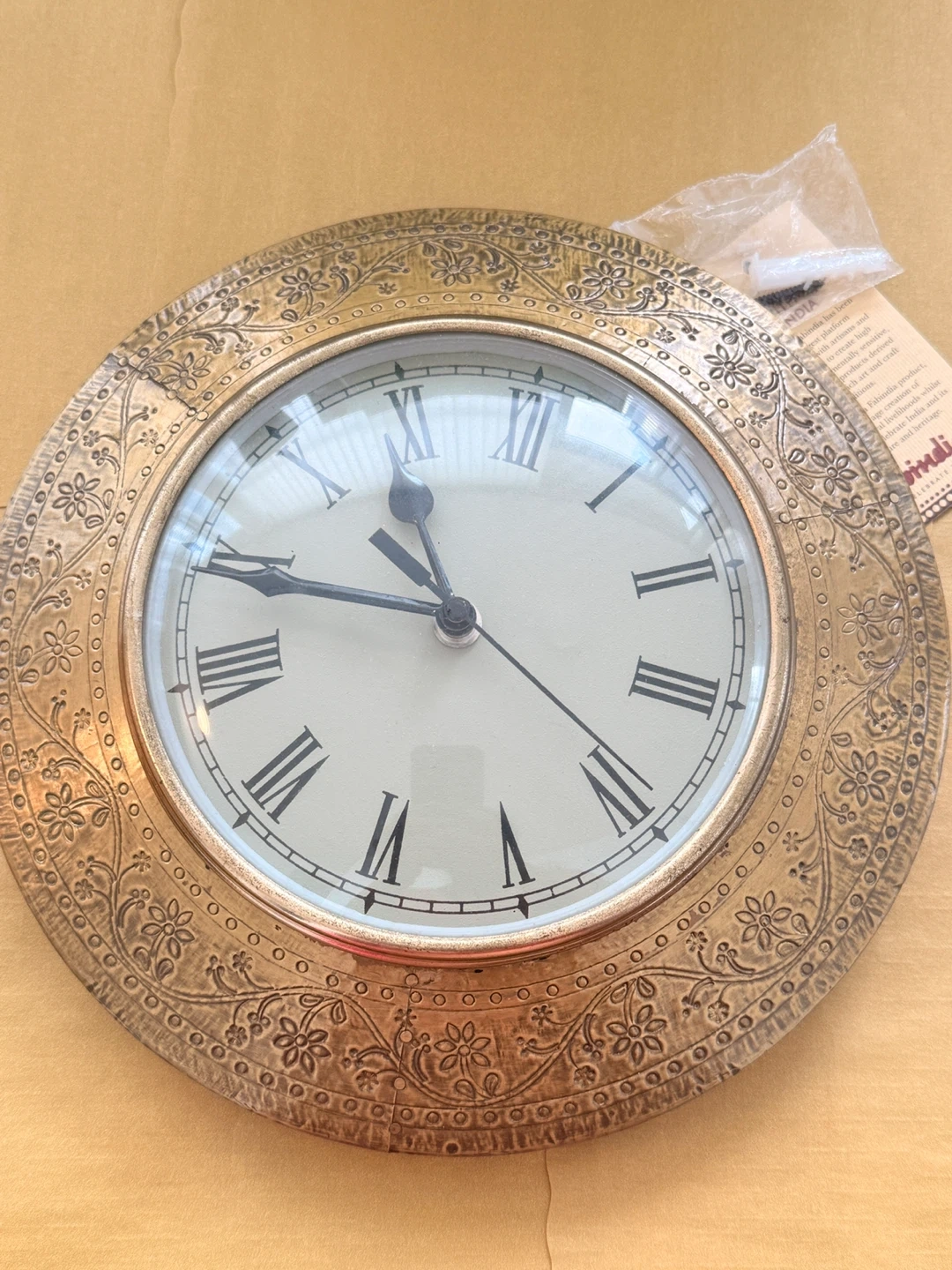 570Selling a beautiful antique decorative wall clock l. It features a unique design with Roman numerals and intricate floral detailing around the frame. Perfect for adding a touch of elegance to any room! Still have its tag on.