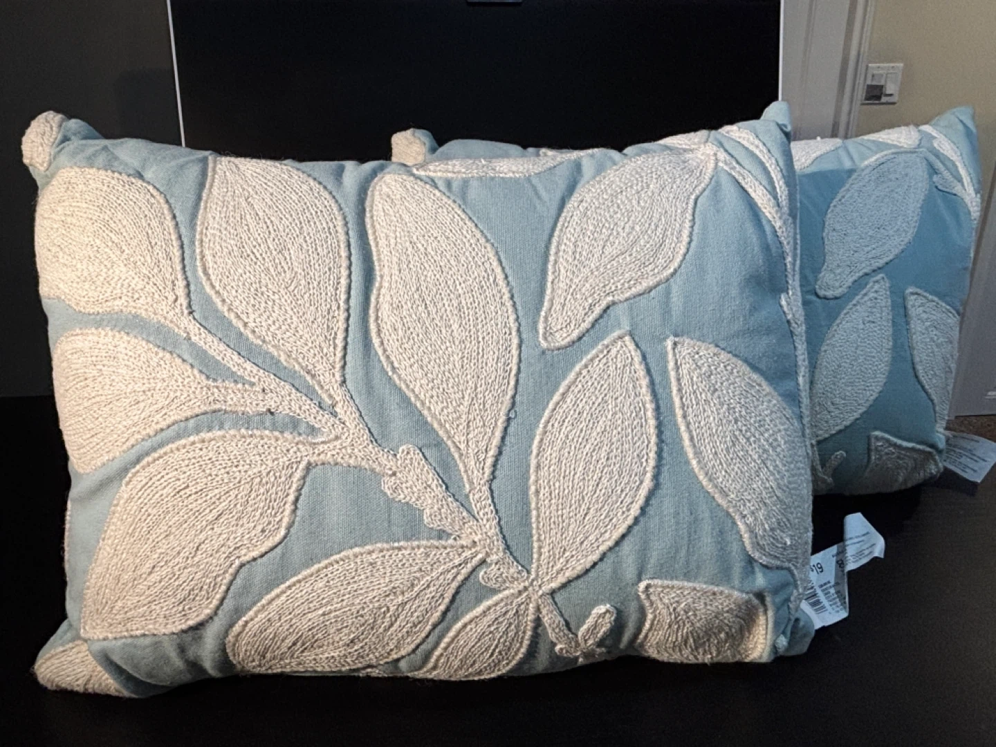 Selling a set of two lovely throw pillows! Brand new. They feature a beautiful floral design in white embroidery on a light blue background. These pillows would add a touch of charm to any living room or bedroom