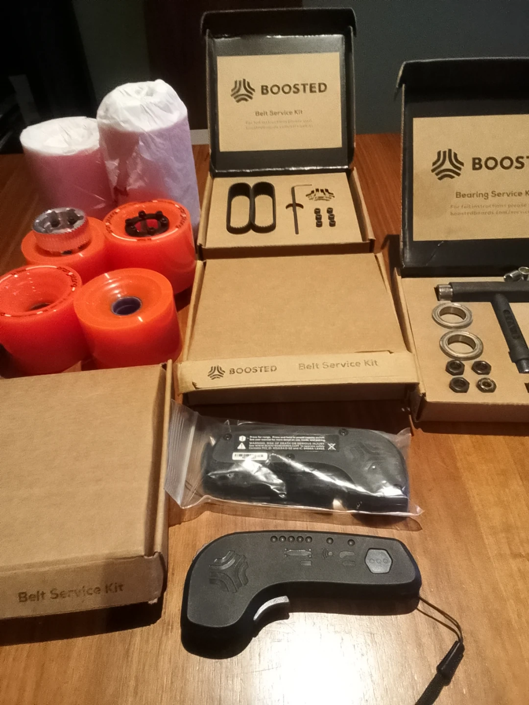 175(Brand New) service kits for Boosted Electric Boards ( 1st & 2nd generation), including belt and bearing kits. Also included are Orangatang wheels. Remote controls ( 1 brand new, other for parts only) Everything you need to keep your board in top shape!. *Cash & pick up only.