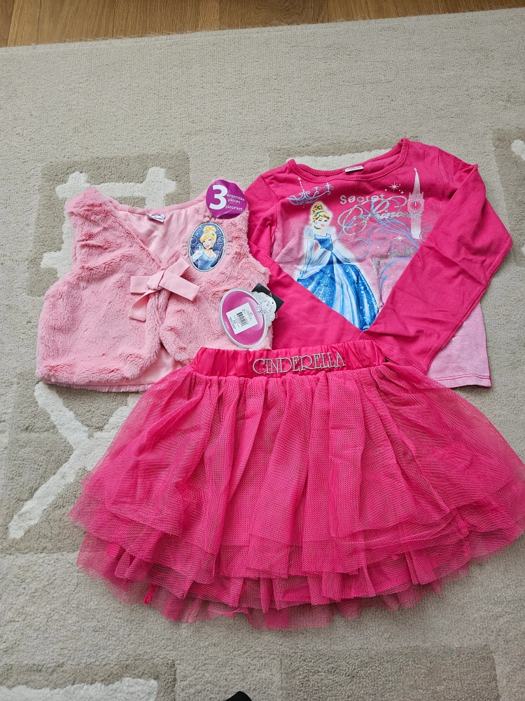 Super cute Cinderella outfit for your little princess! This set includes a long-sleeve top, a tutu skirt and a soft vest. It's in a new condition and ready for a new home!
