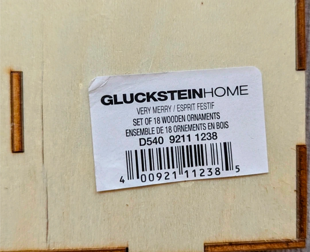 Brand New GlucksteinHome Wooden Ornaments Set Selling a set of 18 wooden ornaments from GlucksteinHome. They come in a wooden box, perfect for storing them away safely after the holidays!