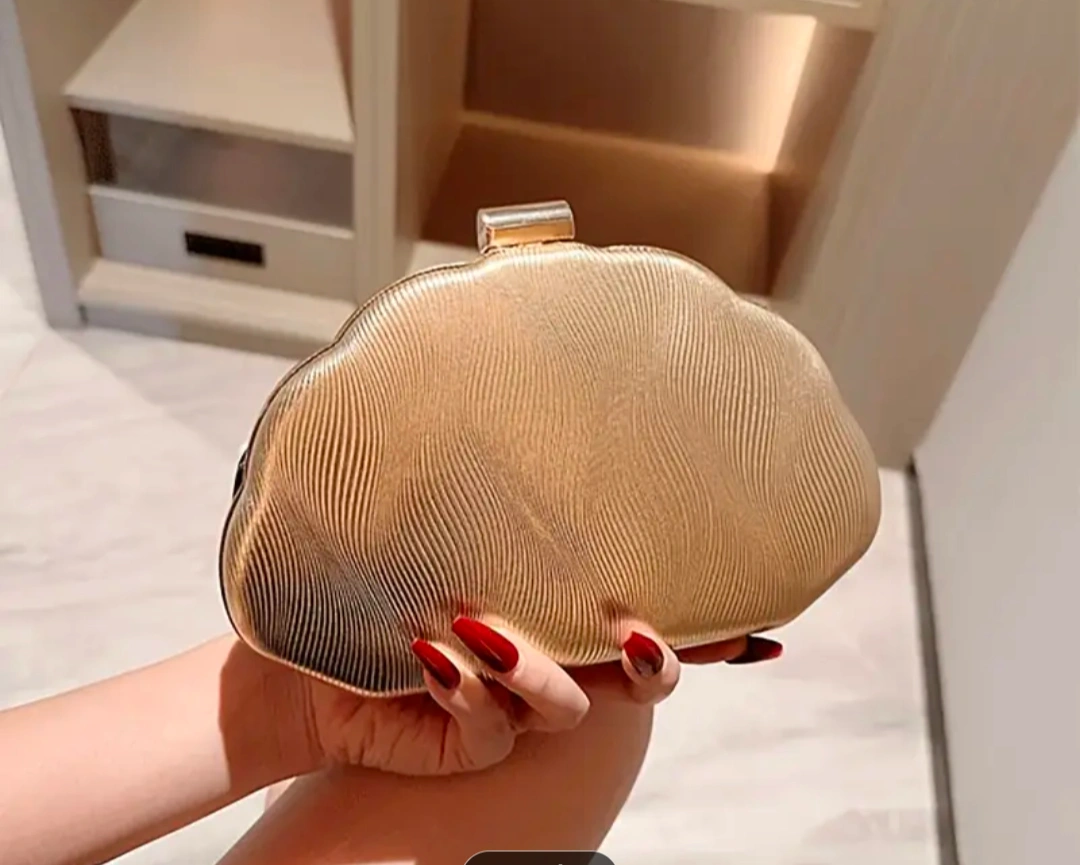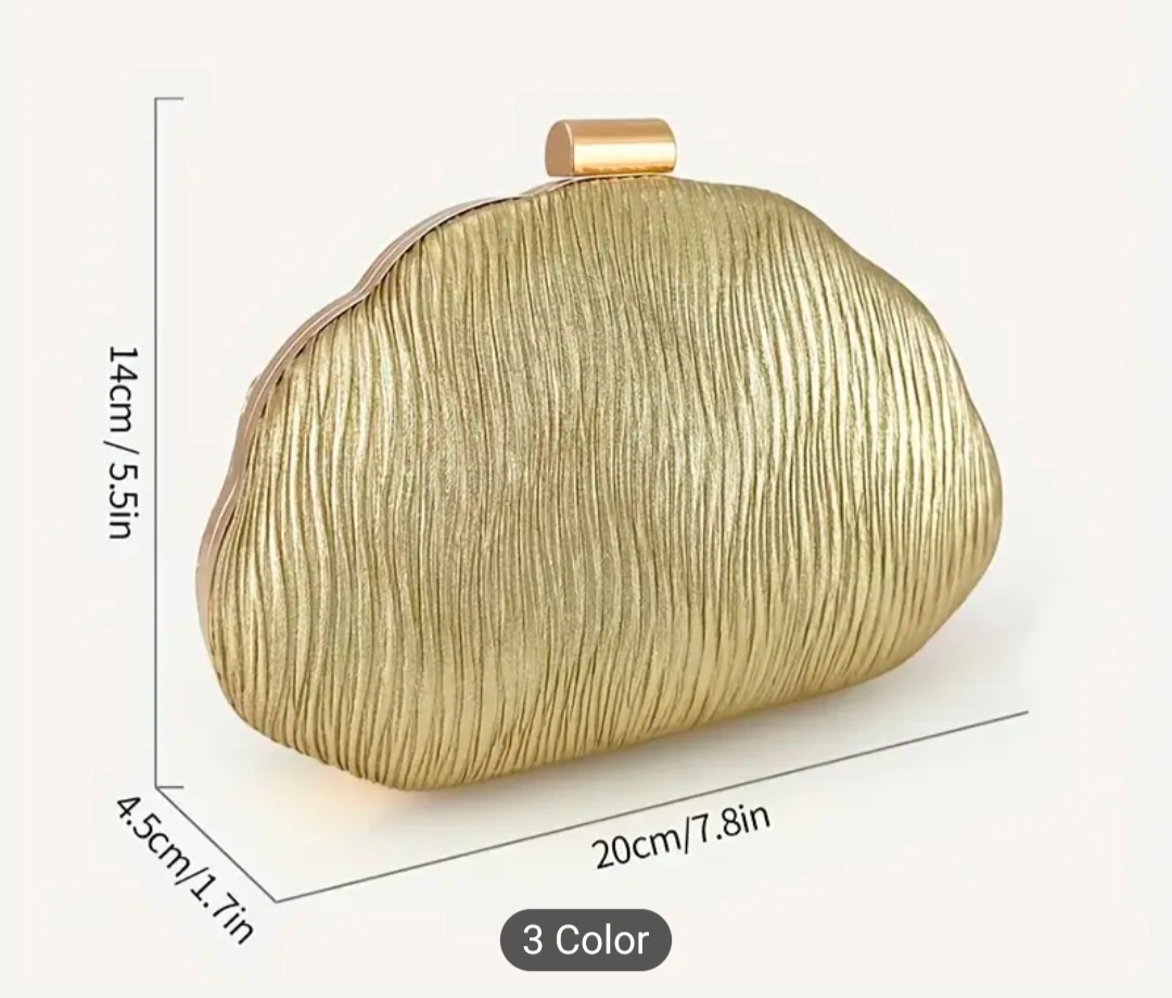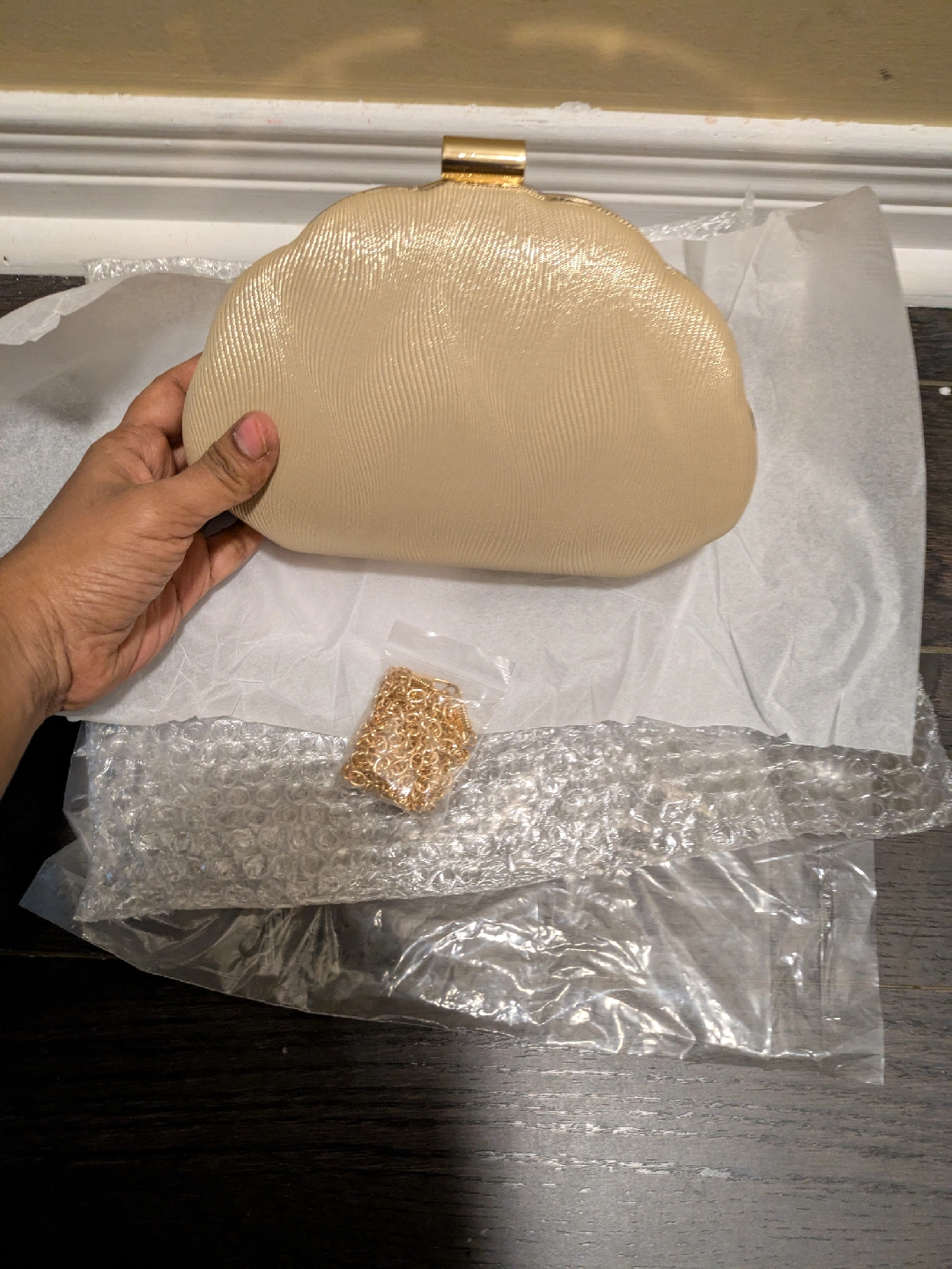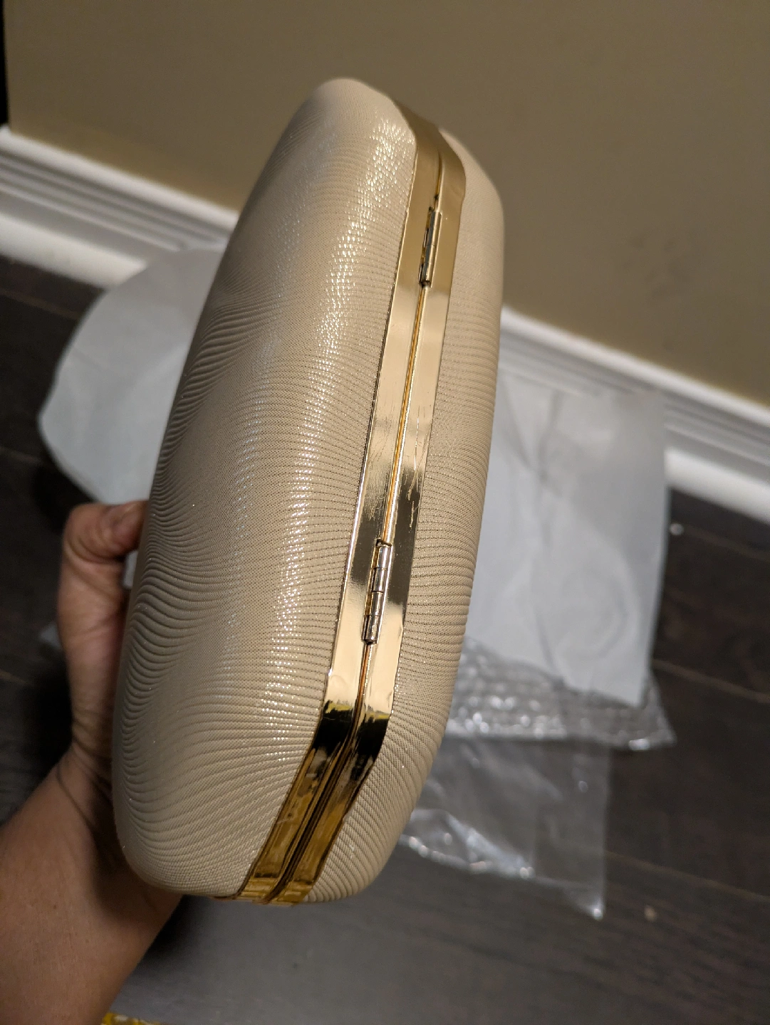 This is a lovely gold clutch purse with a chain strap. It's in great condition and perfect for a night out or special occasion. The dimensions are approximately 20cm x 14cm x 4.5cm. cash only