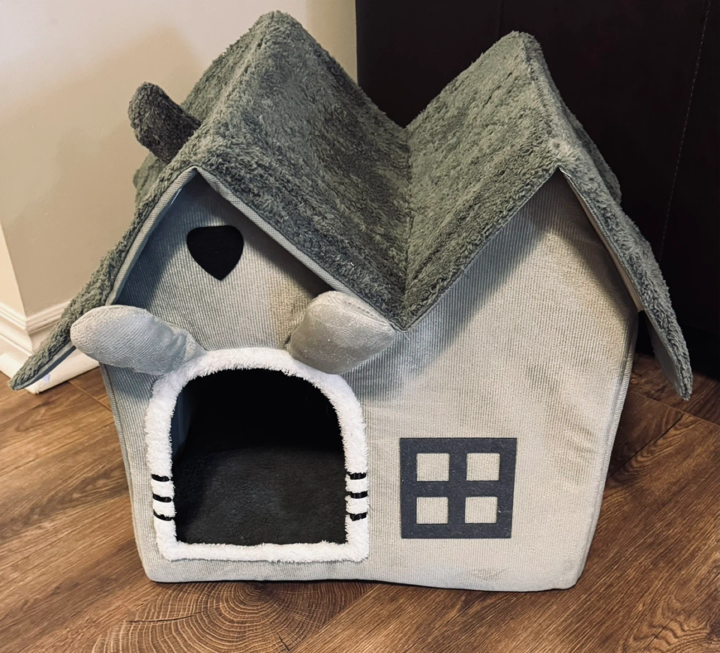79A cute house-shaped pet bed to keep your furry friend cozy! It's in brand new condition and ready for a new home. The bed is grey with a soft, plush interior and a fun house design. Dimensions : approx 20 X 15 X 18 inches