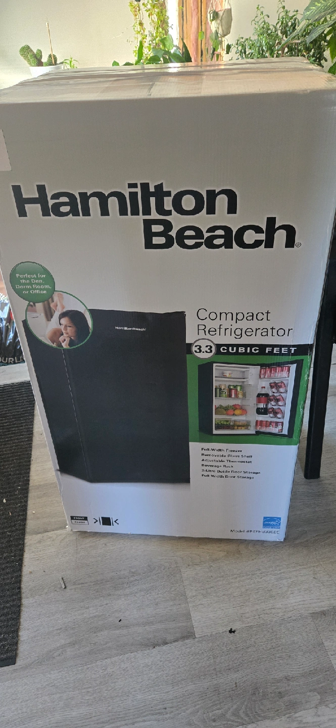 Selling a brand new Hamilton Beach compact refrigerator. It's perfect for a dorm room or office! This fridge has 3.3 cubic feet of space and adjustable thermostat. It also has full-width door storage.
