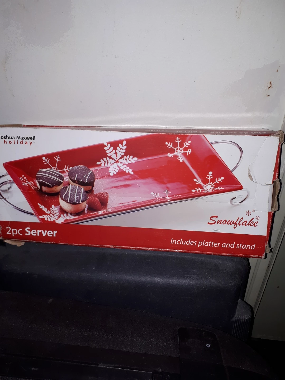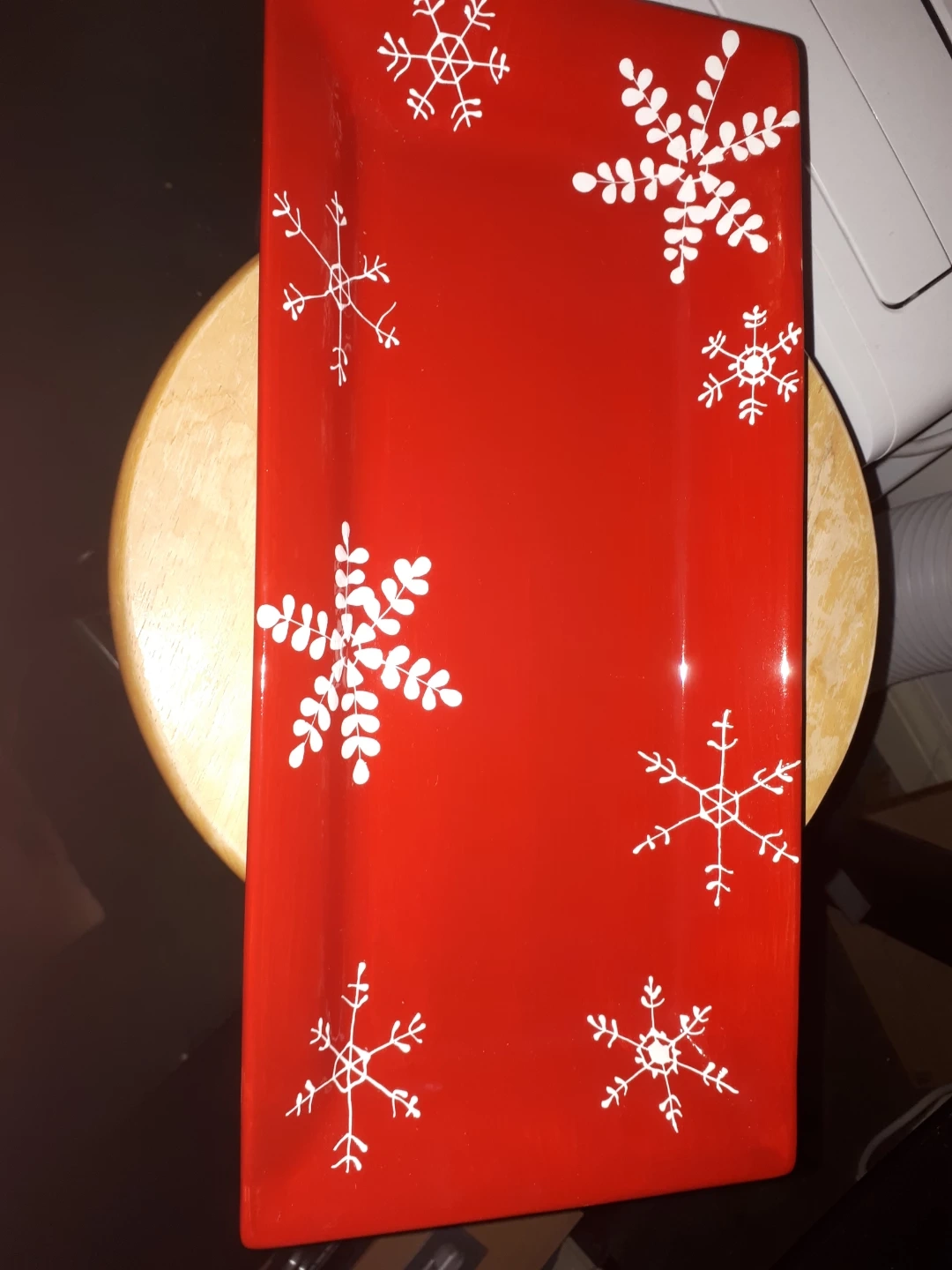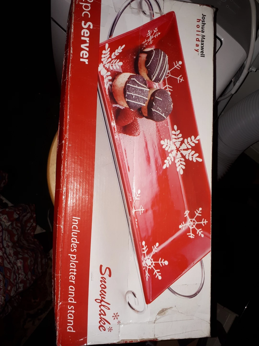2-piece serving set. Red platter with snowflake design. Includes stand. Perfect for appetizers, main courses, and desserts.