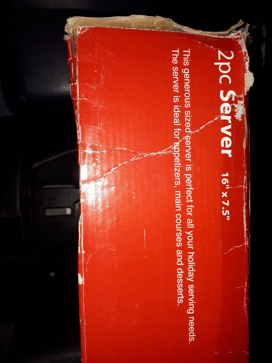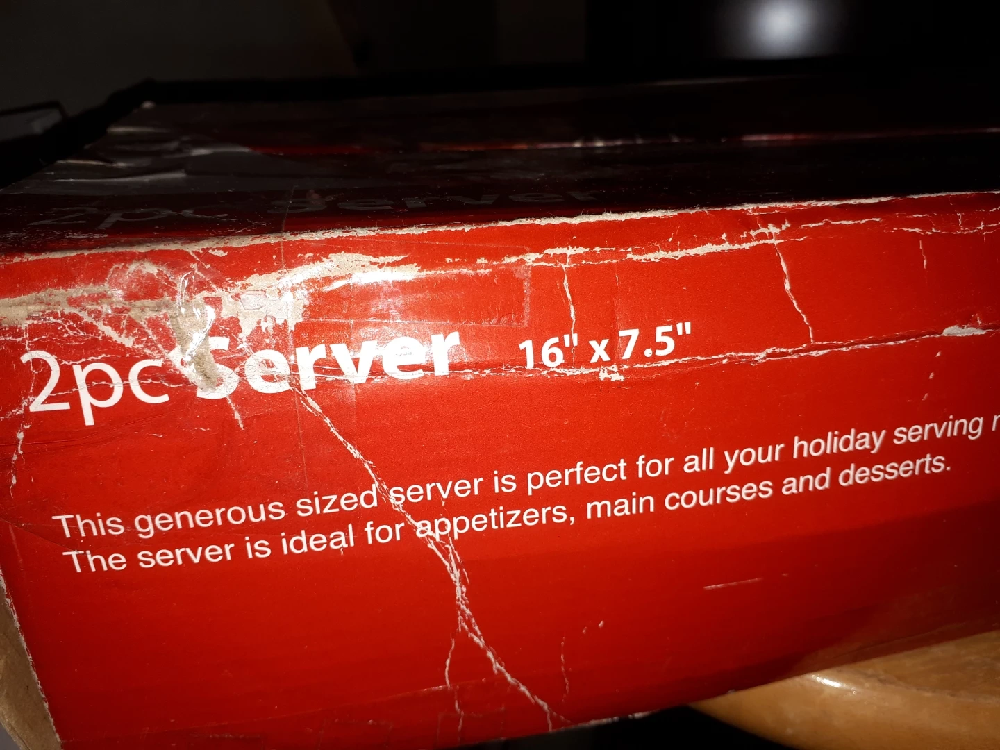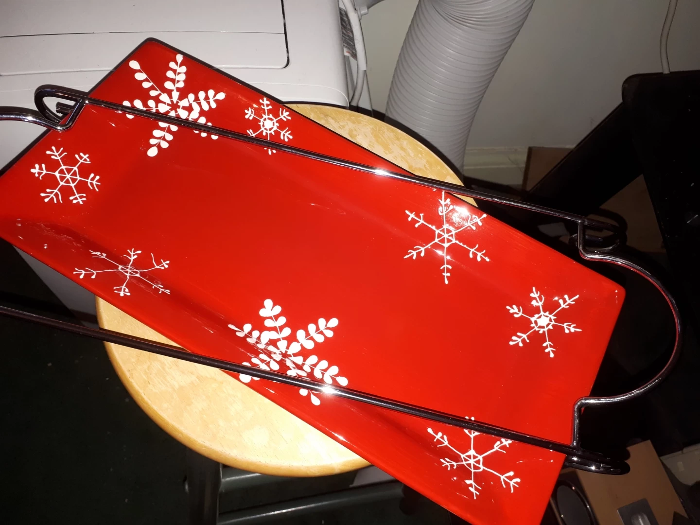 2-piece serving set. Red platter with snowflake design. Includes stand. Perfect for appetizers, main courses, and desserts.