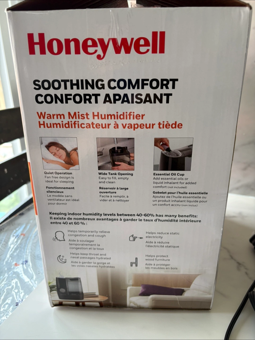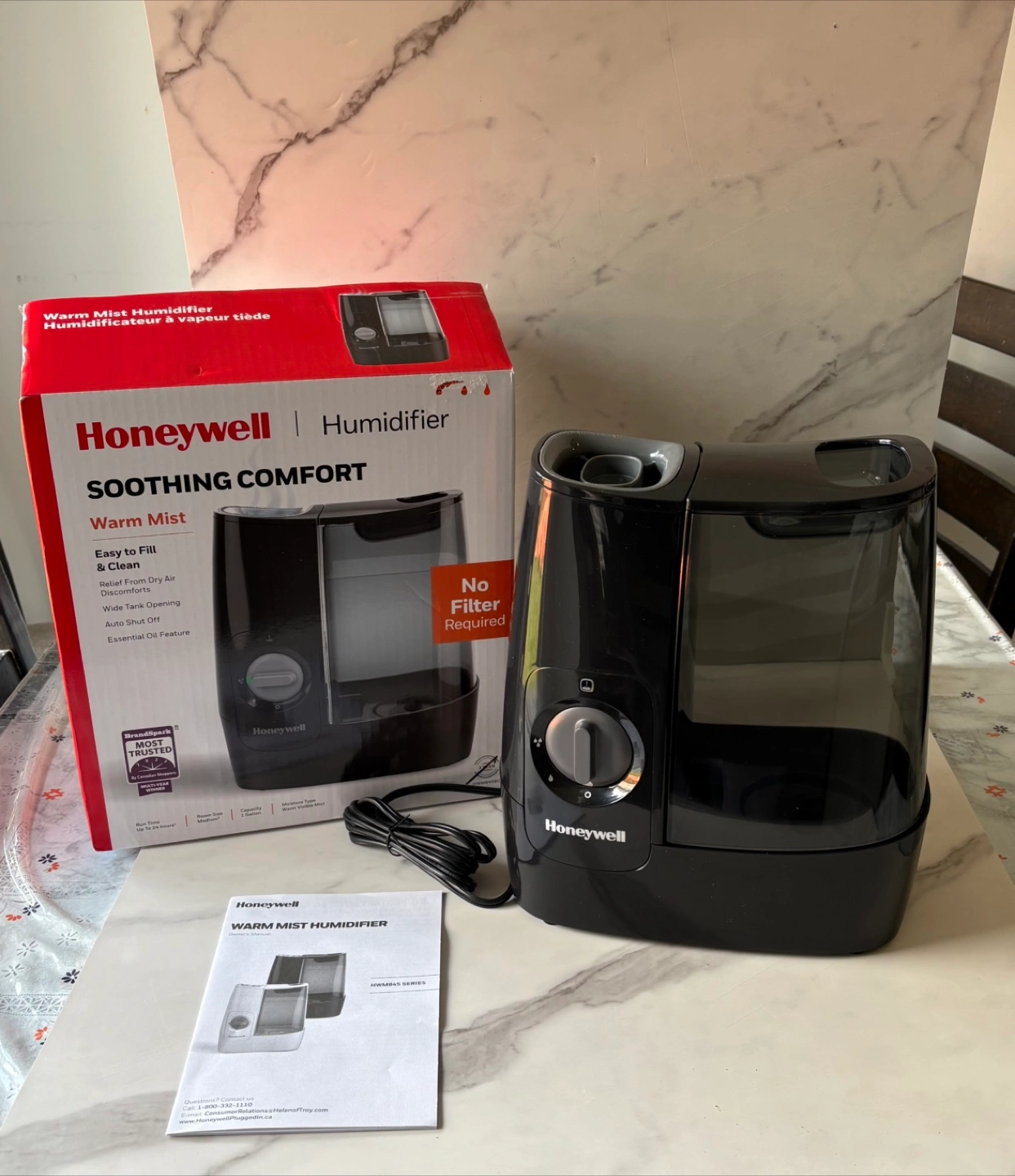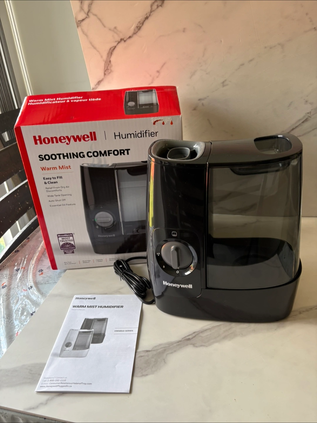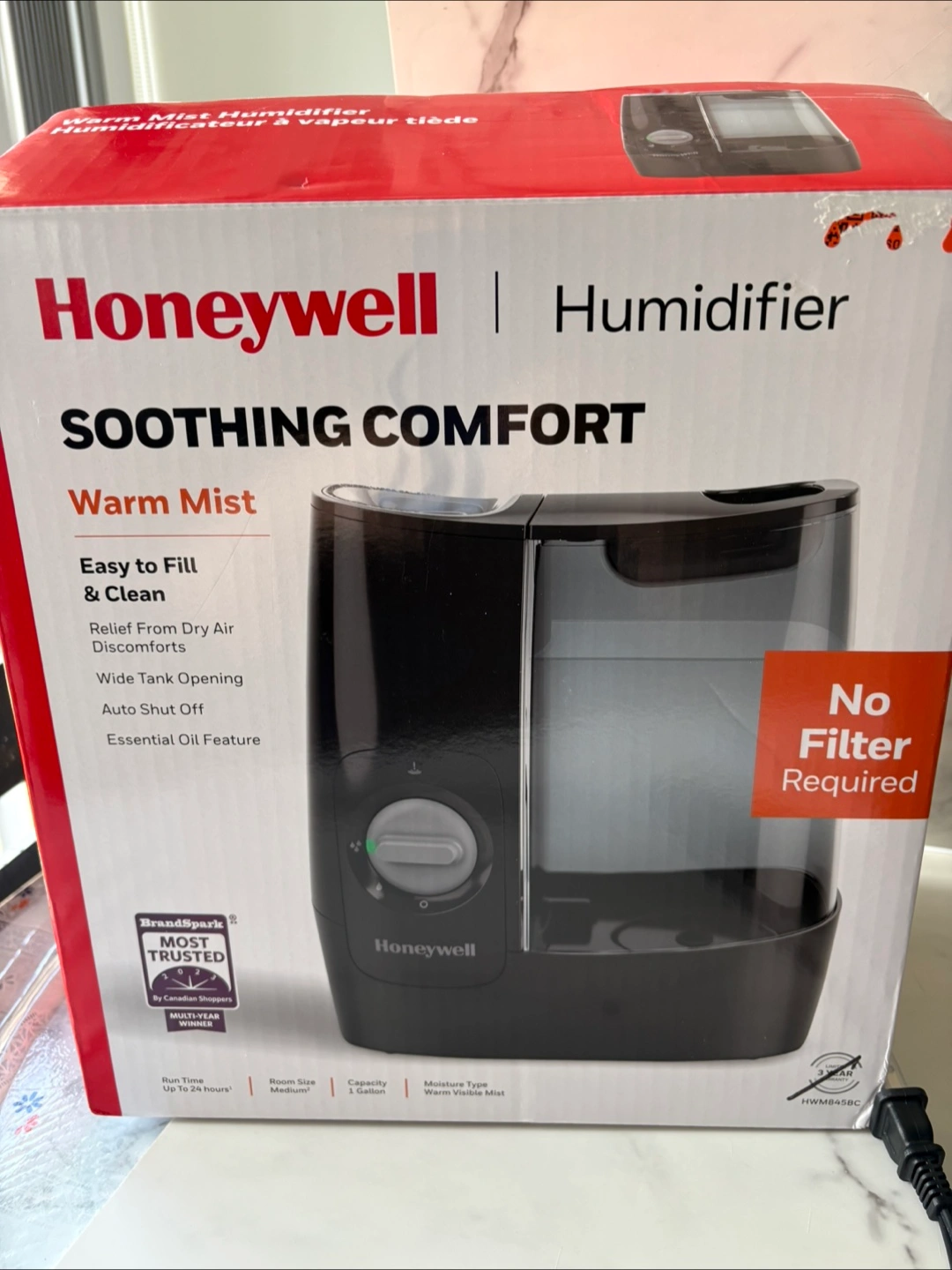 Description: Brand new, never used Honeywell Warm Mist Humidifier (Model HWM845 Series). • No filter required • 1-gallon (3.8L) water tank • Ideal for medium-sized rooms • Runs up to 24 hours • Wide tank opening for easy filling and cleaning • Auto shut-off for safety • Essential oil tray for aromatherapy use Price is final, no negotiations. Item is exactly as shown in the pictures