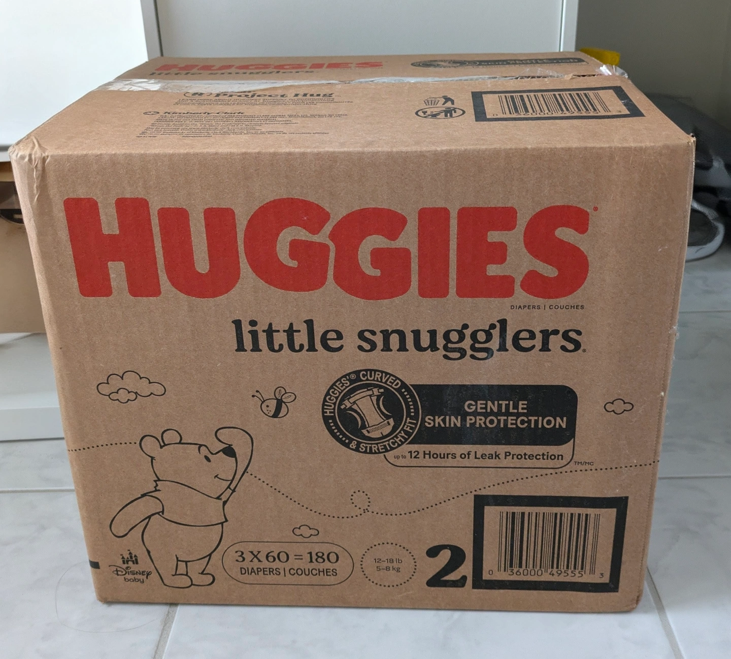 Selling a box of Huggies Little Snugglers diapers, size 2. There are 180 diapers in the box (3 packs of 60). They're designed for gentle skin protection and can provide up to 12 hours of leak protection. Comes in original box. Sealed and unopened. See other listings for more diapers. Pick Up Markham - can arrange for exact location.