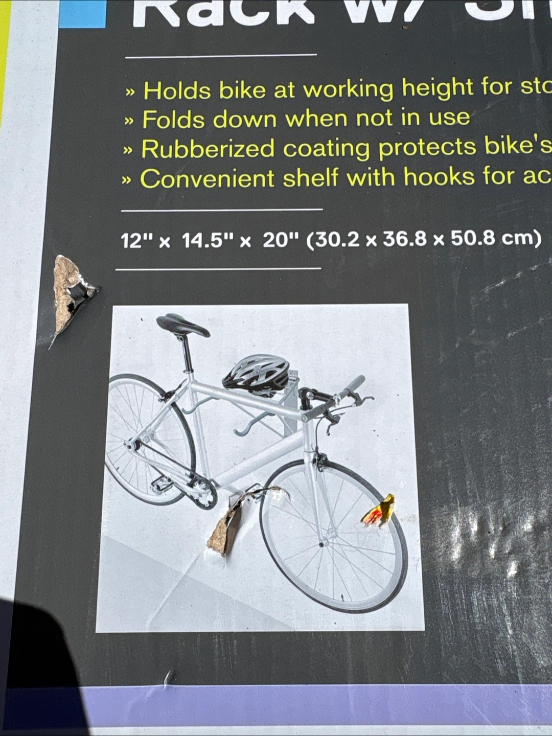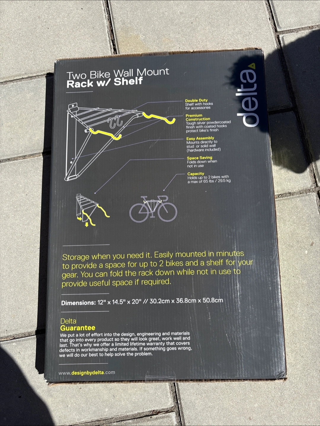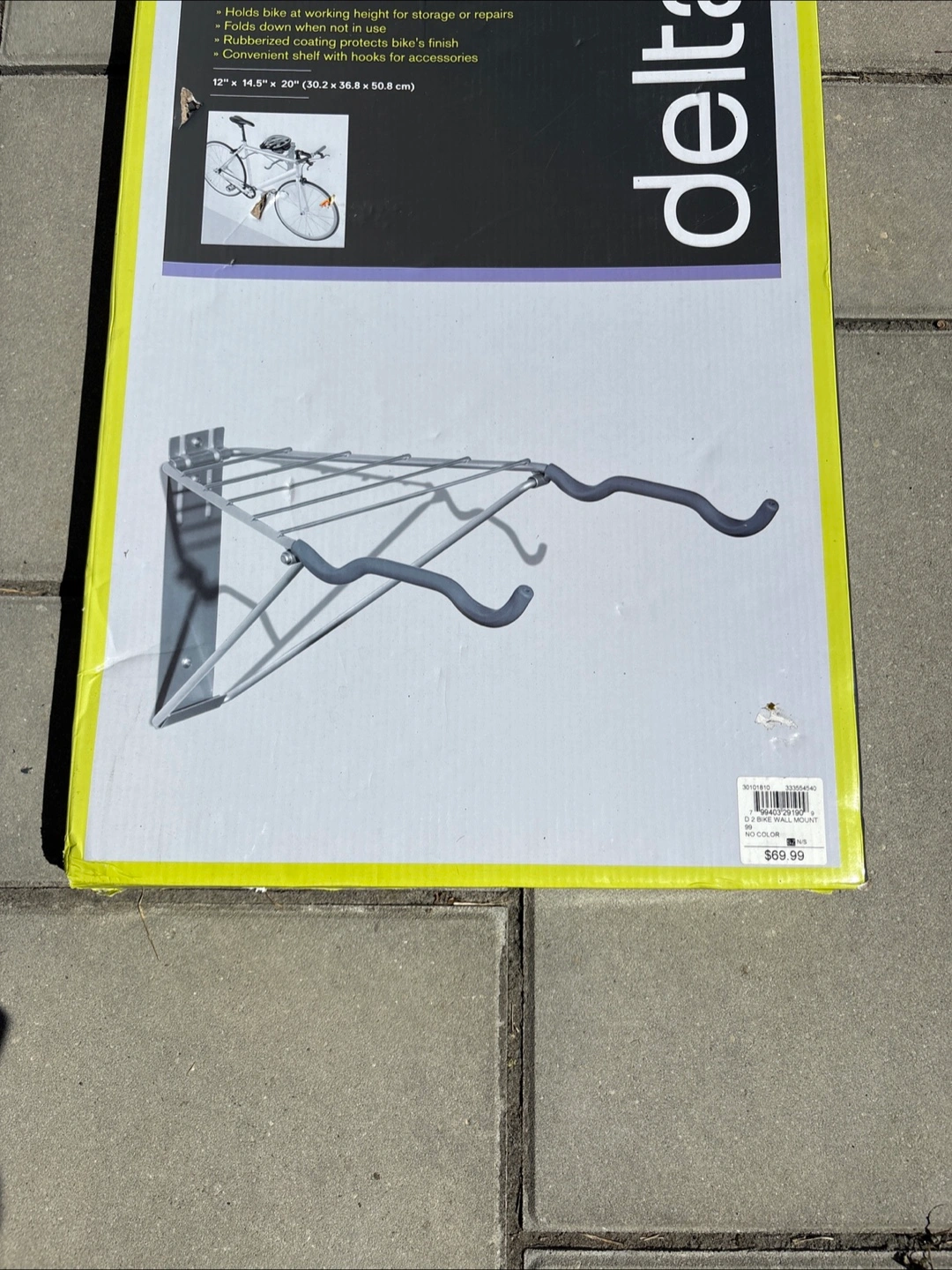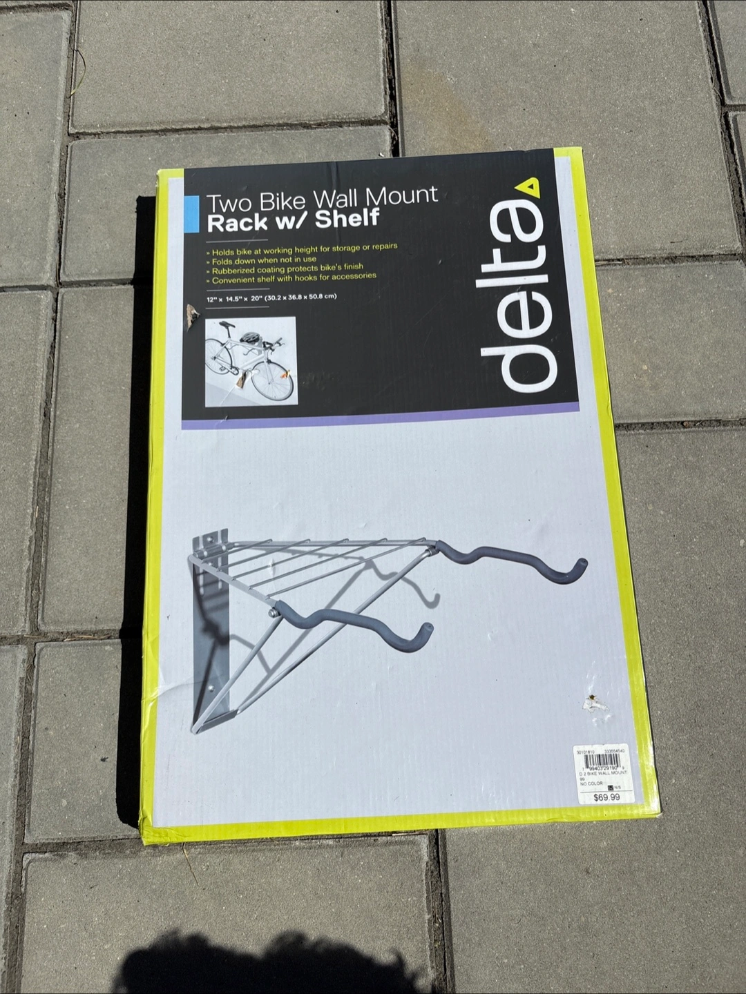 Delta Two Bike Wall Mount Rack with Shelf for easy storage and repairs! - Holds bike at working height - Folds down when not in use - Rubberized coating protects bike's finish - Convenient shelf with hooks for accessories - Dimensions: 12" x 14.5" x 20" (30.2 x 36.8 x 50.8 cm) Originally bought for $69.99, comes in the original box
