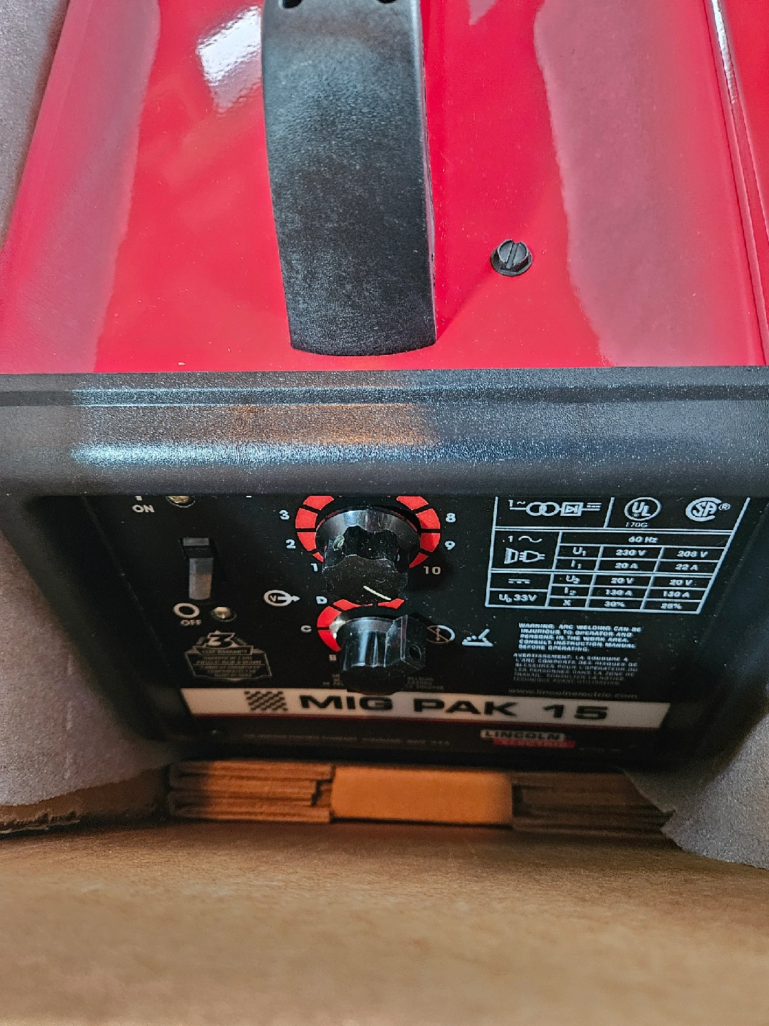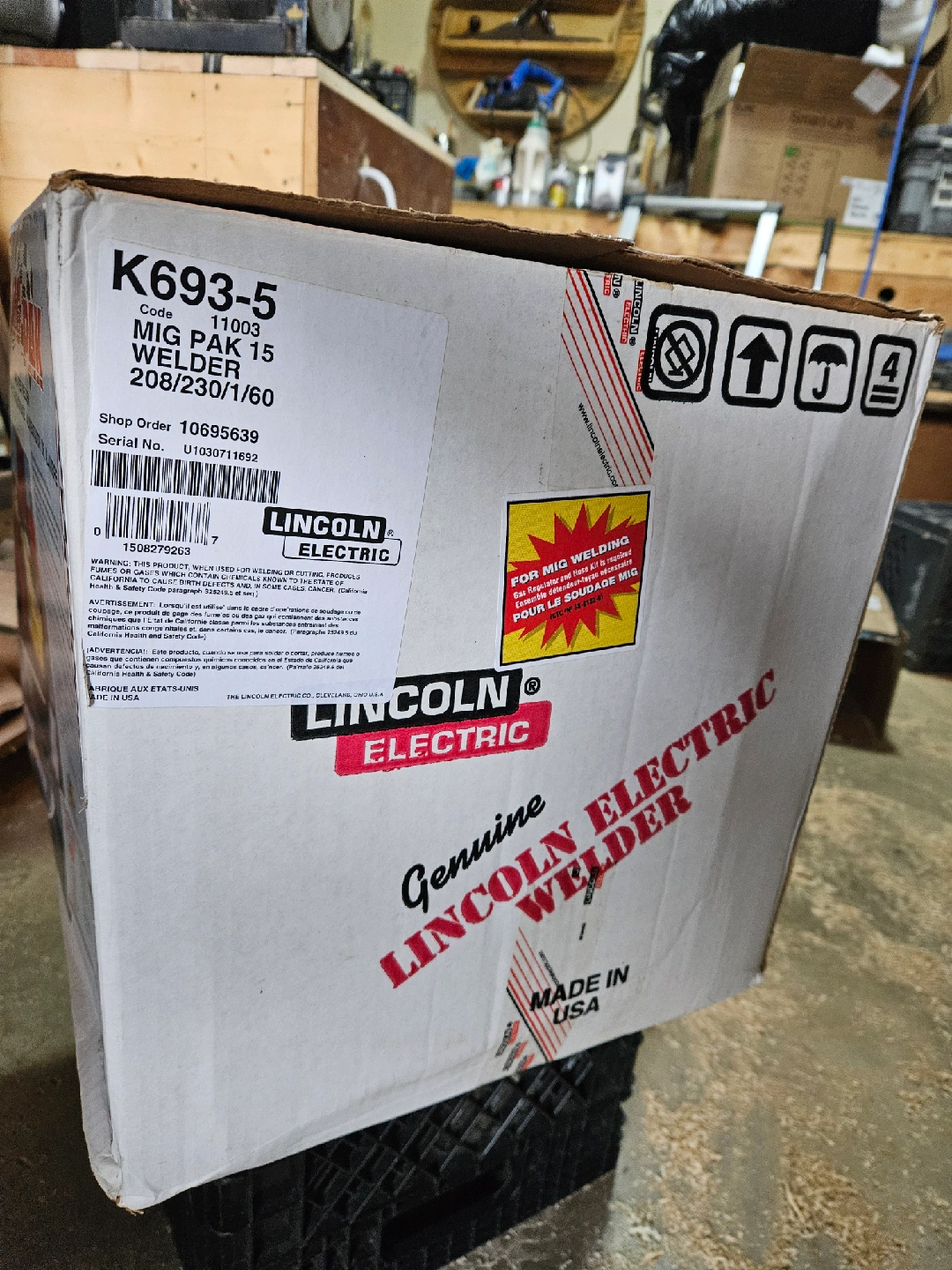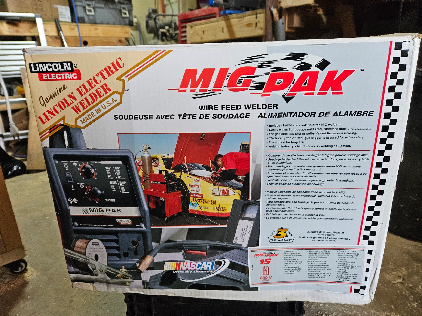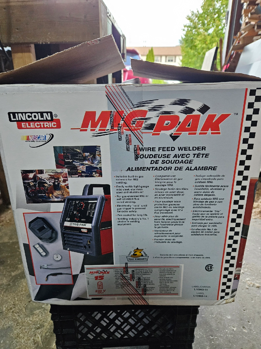 18Selling a brand new Lincoln Electric MIG PAK 15 wire feed welder! It includes built-in gas valve, dual range operation for light gauge steel and aluminum, and is electrically cold - weld until trigger is pulled for safety. Also includes a welding mask and two rolls of welding wire. Comes with the original box!