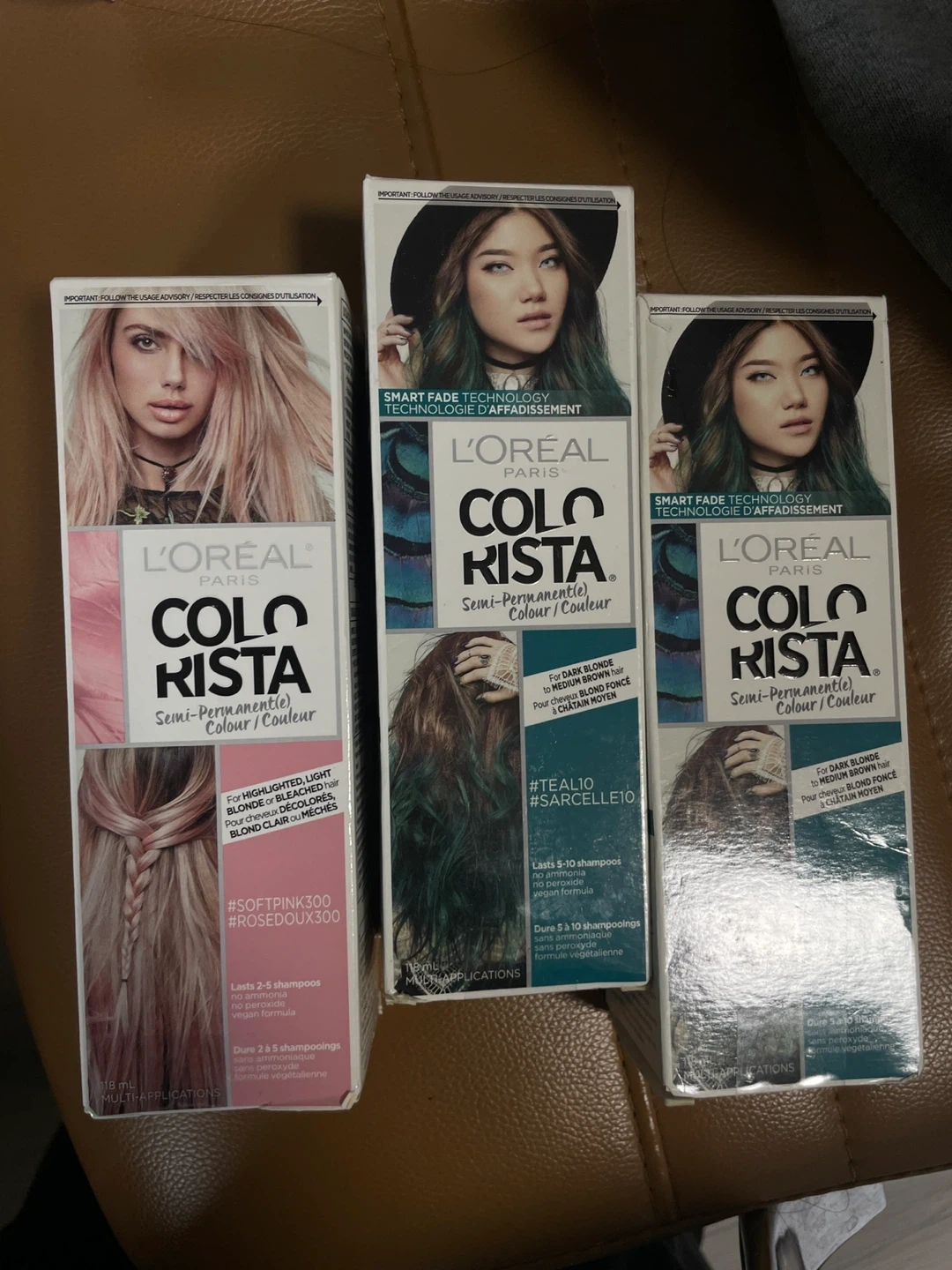 $10/each Selling three boxes of L'Oréal Paris Colorista semi-permanent hair colour! - One in #SoftPink300 #RoseDoux300, for highlighted, light blonde, or bleached hair. Lasts 2-5 shampoos and is a vegan formula - Two in #Teal10 #Sarcelle10, for dark blonde to medium brown hair. Lasts 5-10 shampoos and is a vegan formula