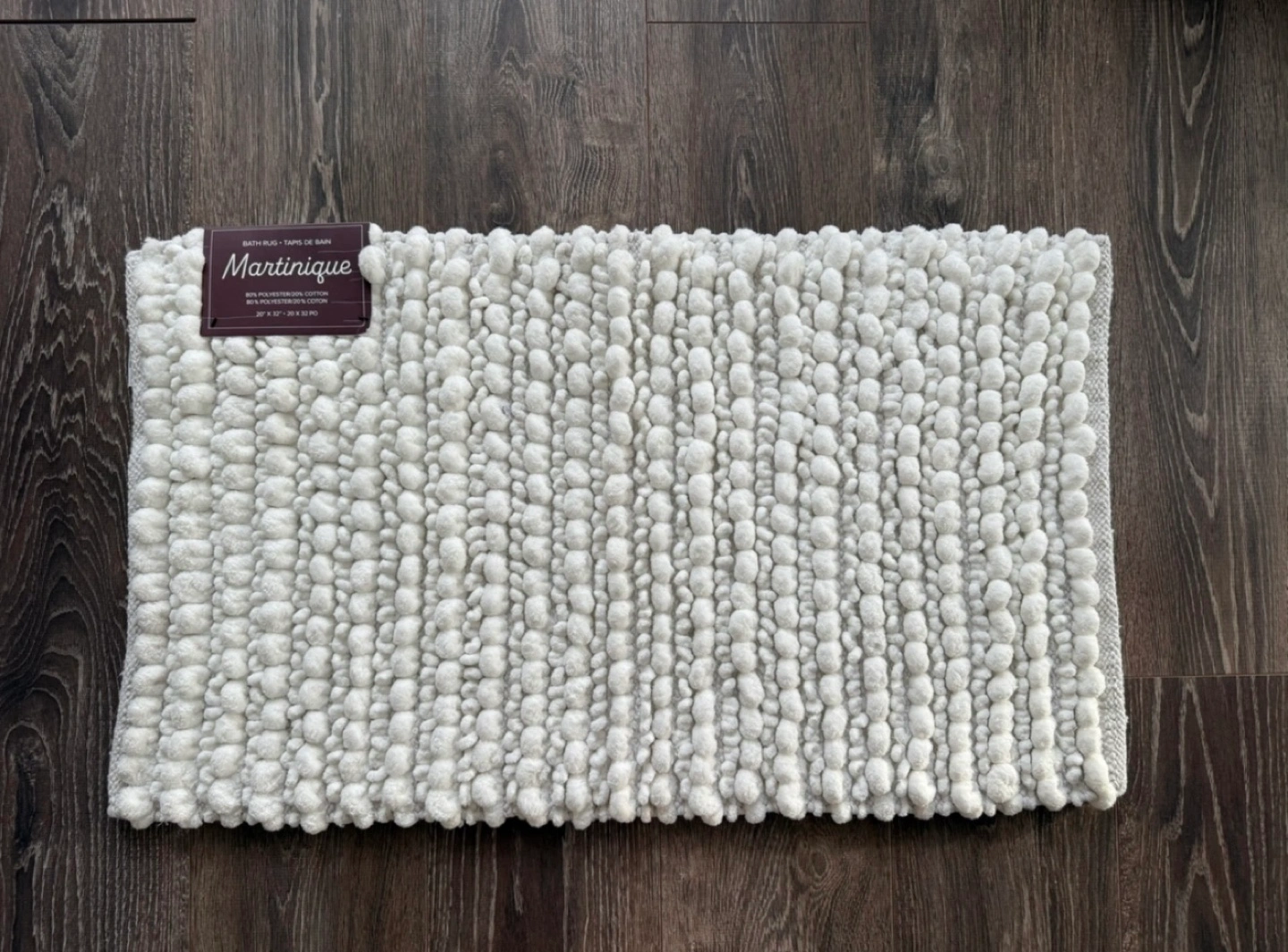 Soft, textured bath rug. Machine washable. Measures 20" x 32". Made in India.