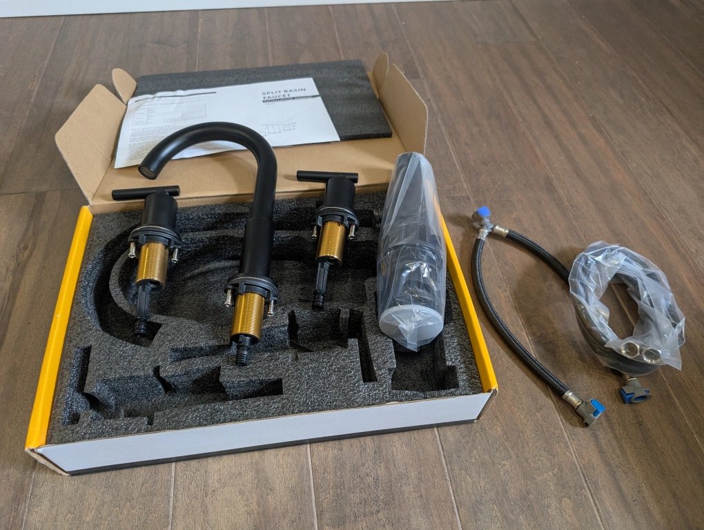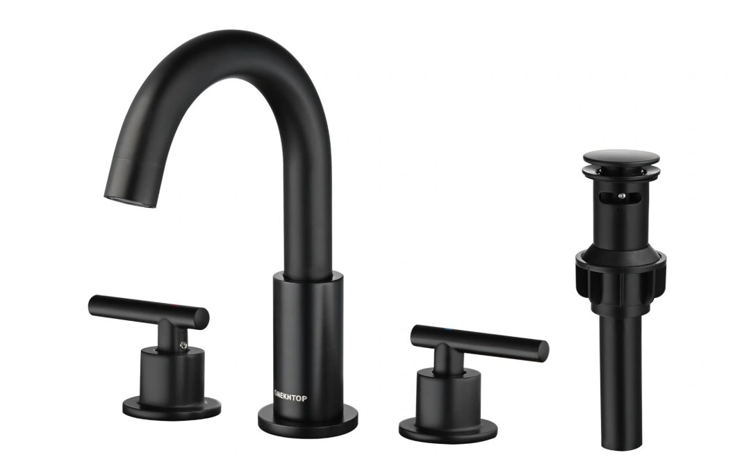 Brand new matte black bathroom faucet for sale. 3 hole, 2 handle, pop up drain included, modern widespread sink basin, $50 FIRM each, 2 available. faucet, water, reno, vanity, counter, water, bathroom, sink, renovation, hose, plumbing, kitchen, drain, shower, tub, bath, bathtub, swivel, pull down, pull out, spray, nozzle, handle, Moen, Delta, dishes