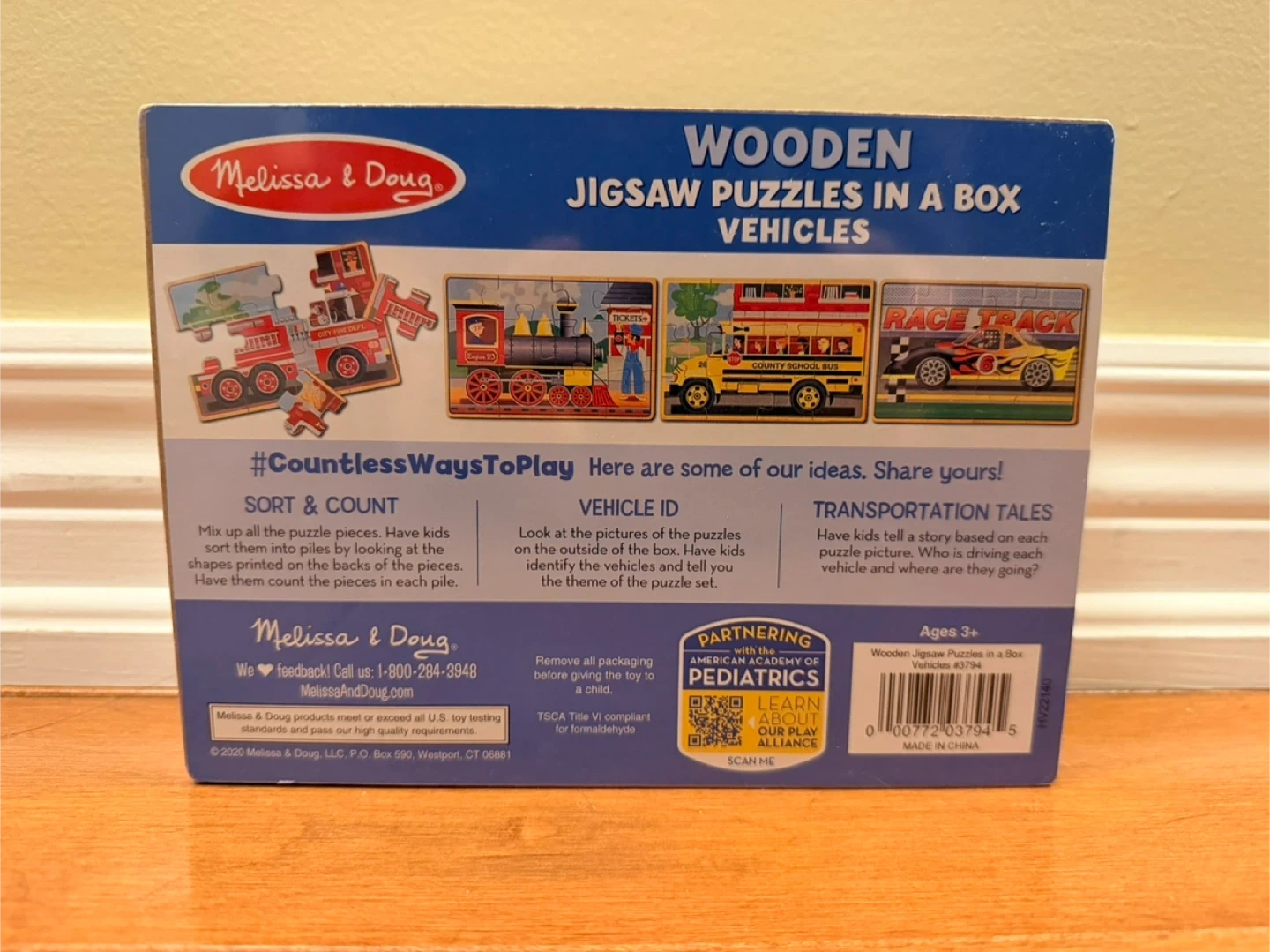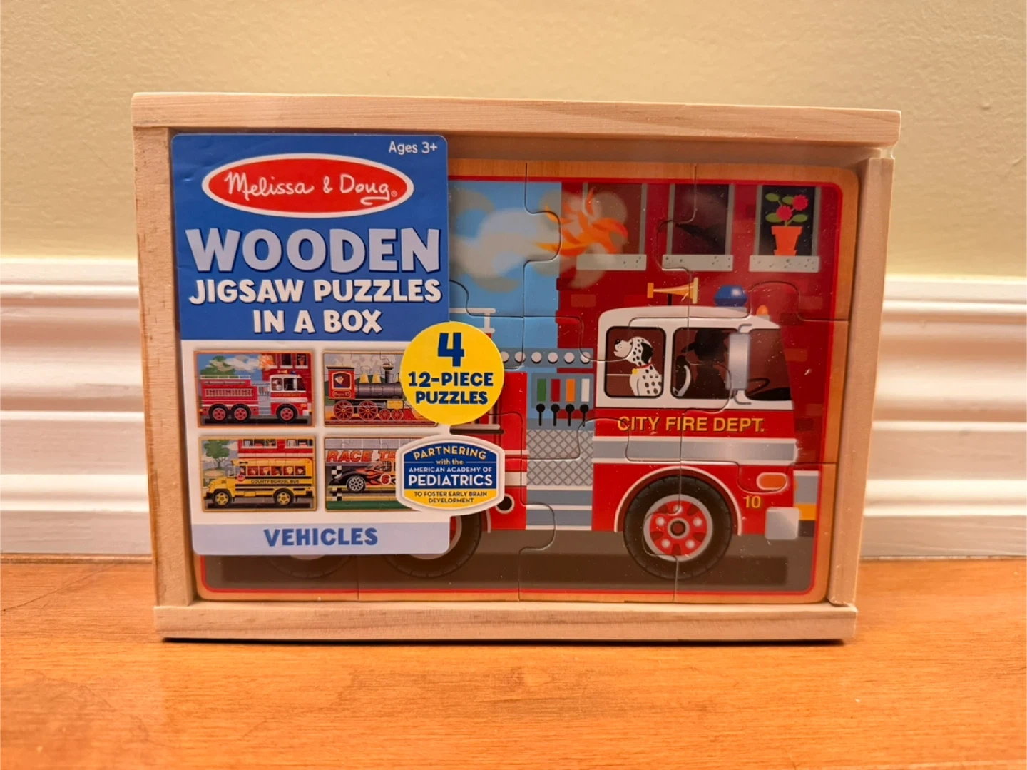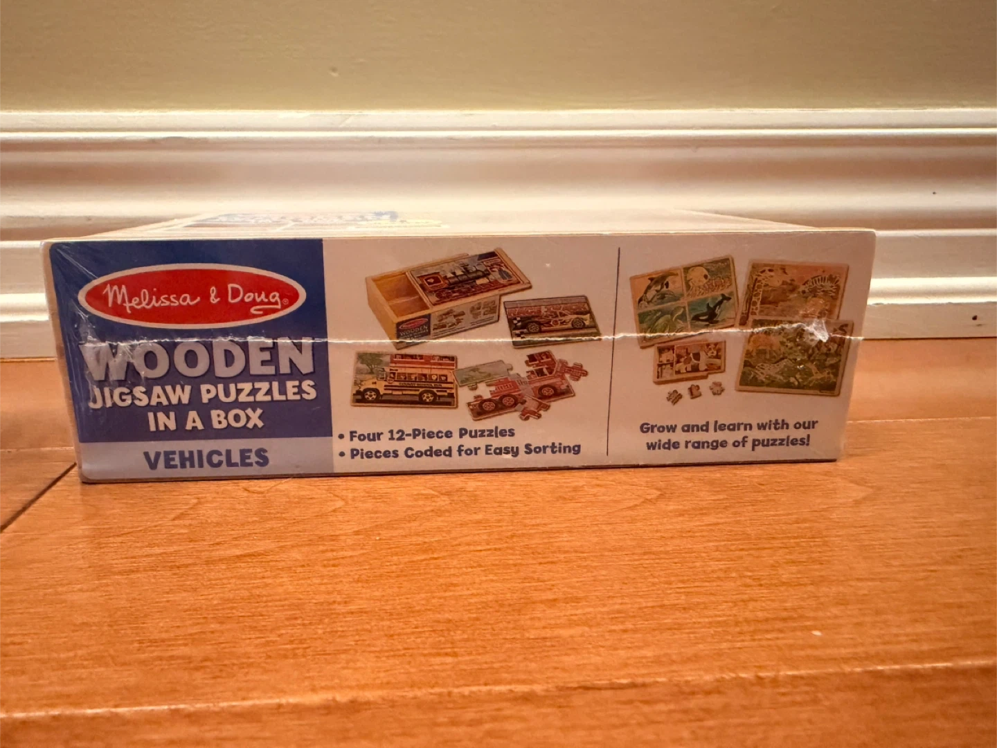 96Brand New Melissa & Doug Wooden Jigsaw Puzzles in a Box - Vehicles I'm selling a brand new Melissa & Doug Wooden Jigsaw Puzzles in a Box, featuring a fun vehicles theme! It includes four 12-piece puzzles, each coded for easy sorting. The set is designed for ages 3+ and comes in its original wooden box. Perfect for developing sorting skills and telling transportation stories! Clean, smoke free home Pick up in North Ajax