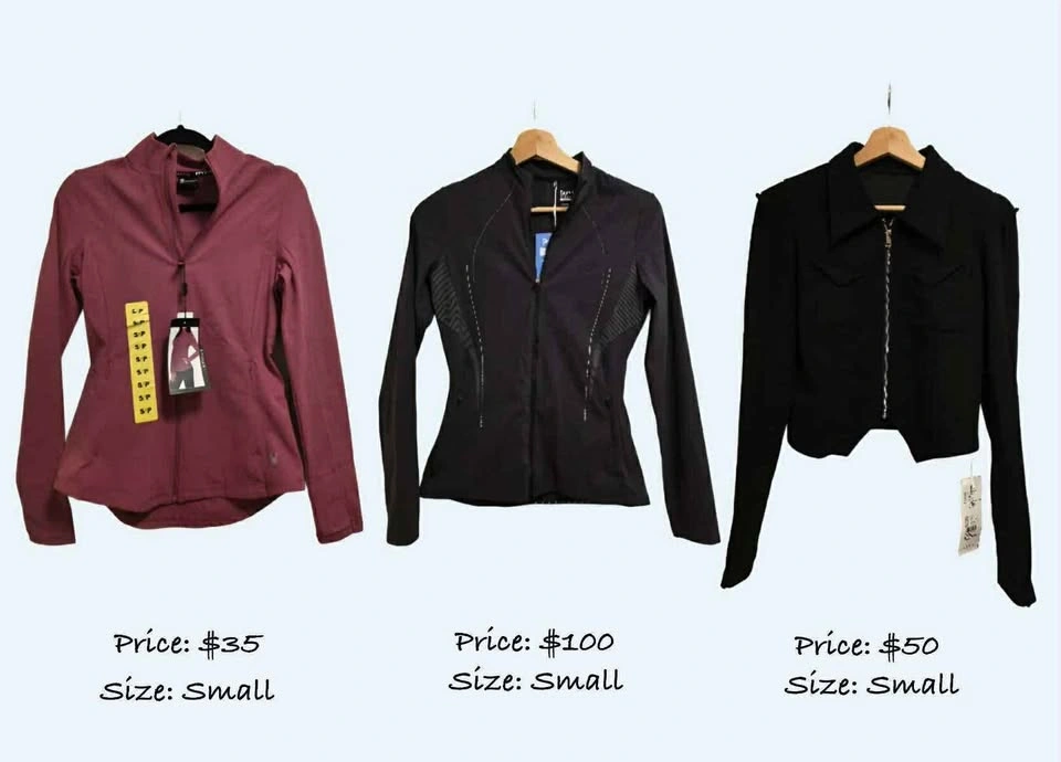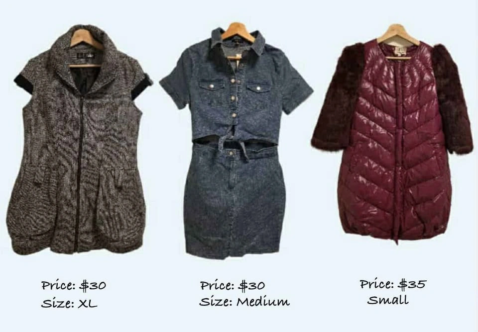 65Helping my mom sell clothes she collected. All in new condition, never worn. Includes dresses, jackets, tops, pants & more. Sizes vary (mostly Small & Medium). Prices are shown in the collages. If you're interested, send me a screenshot and circle the item, and I’ll send more photos/info. Thanks for looking. Pick up near Holdom Skytrain Station.