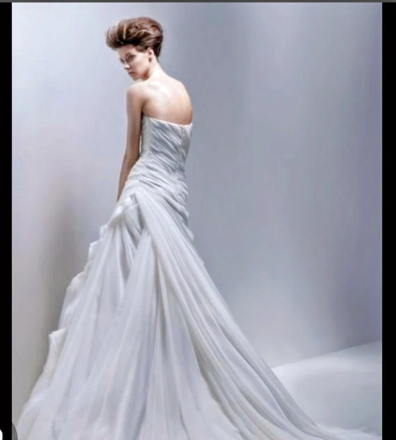 Beautiful designer wedding dress for sale! size 6! It's a stunning white gown with gorgeous layers. A true show stopper this is the perfect dress for your special day ๐