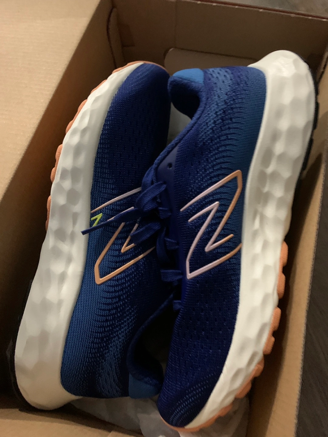 60Stylish shoes, brand new, never worn. The shoes are blue, with a white and peach sole. They still sit in their original packaging. No tags. Pick up Fort Erie