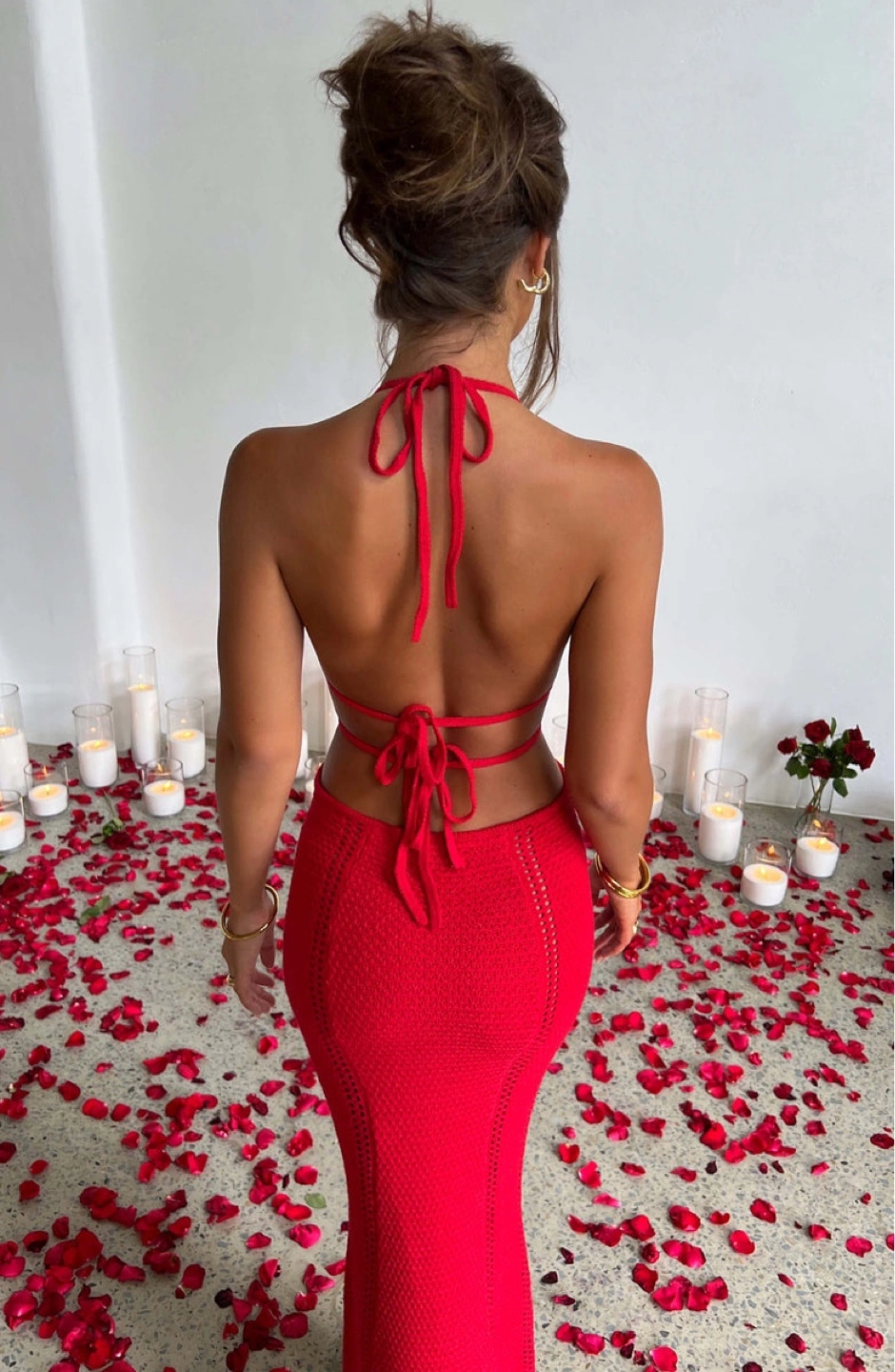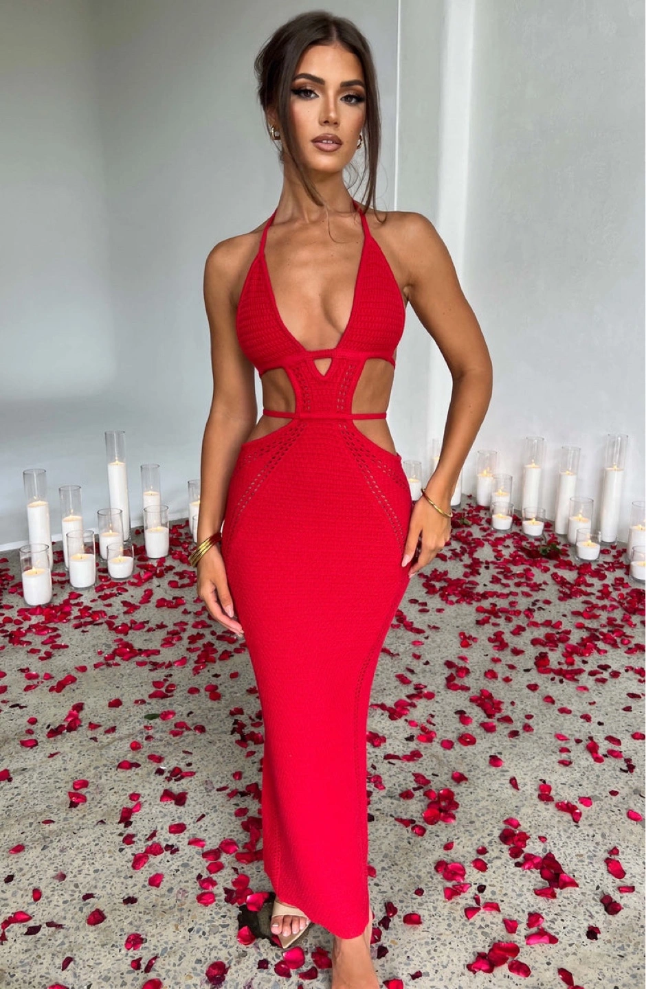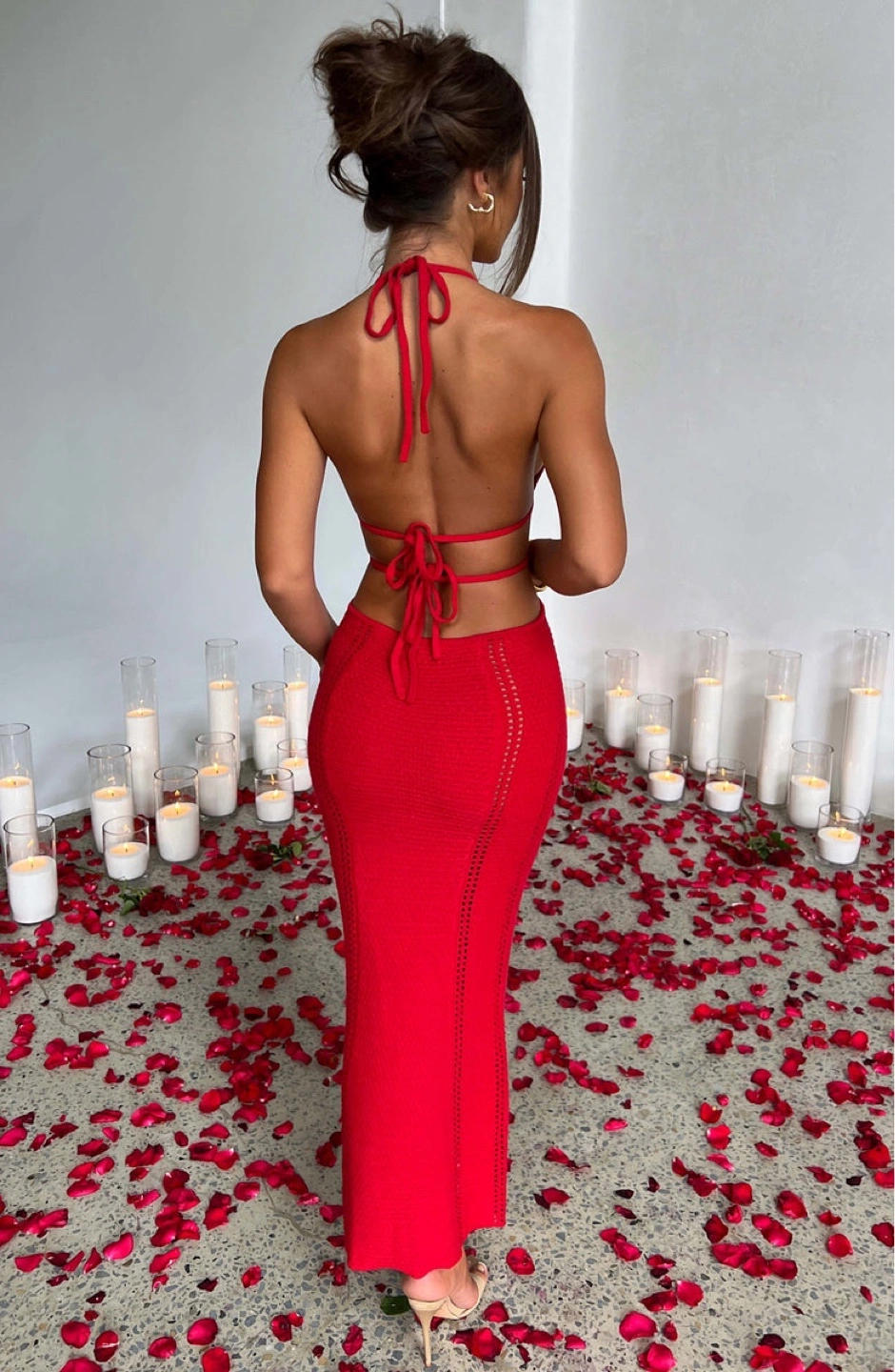 15Stunning red maxi dress. Features a halter neck, cut-out detailing, and a figure-hugging silhouette. Knitted fabric. Perfect for a special occasion.