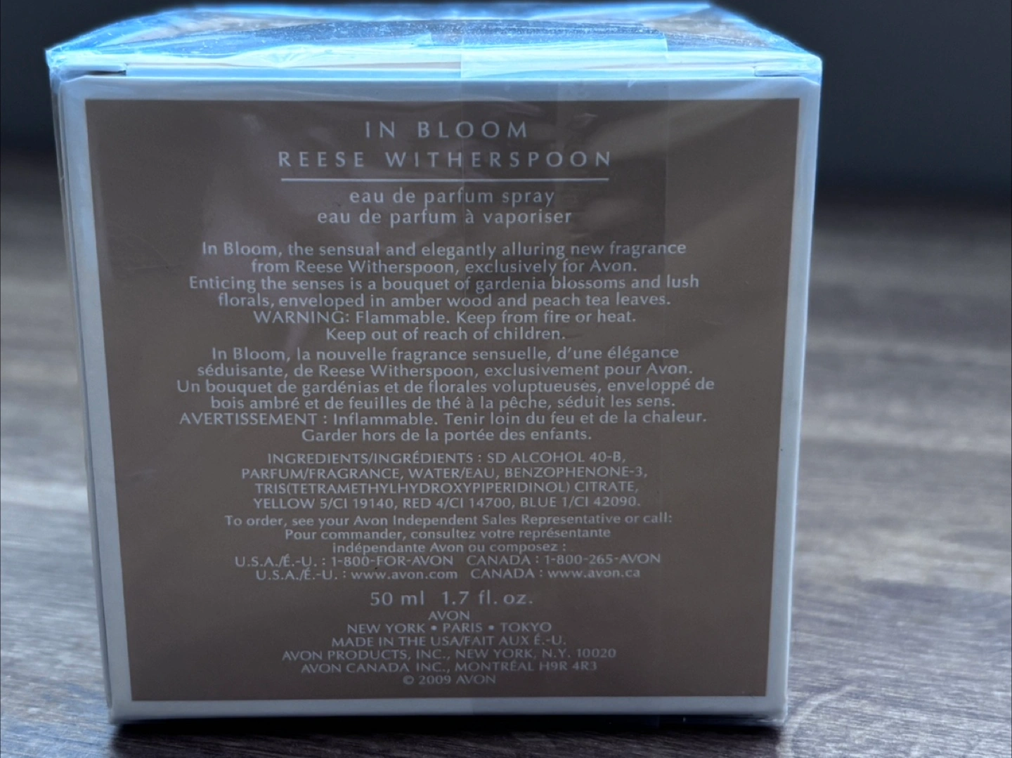 Brand new In Bloom Reese Witherspoon Eau de Parfum! It's still in its original packaging and has never been opened. - Size: 50 ml - Eau de parfum spray This sensual fragrance features gardenia blossoms, lush florals, amber wood, and peach tea leaves. If it’s listed, it’s available Located in the Mission Gardens area Transcona.